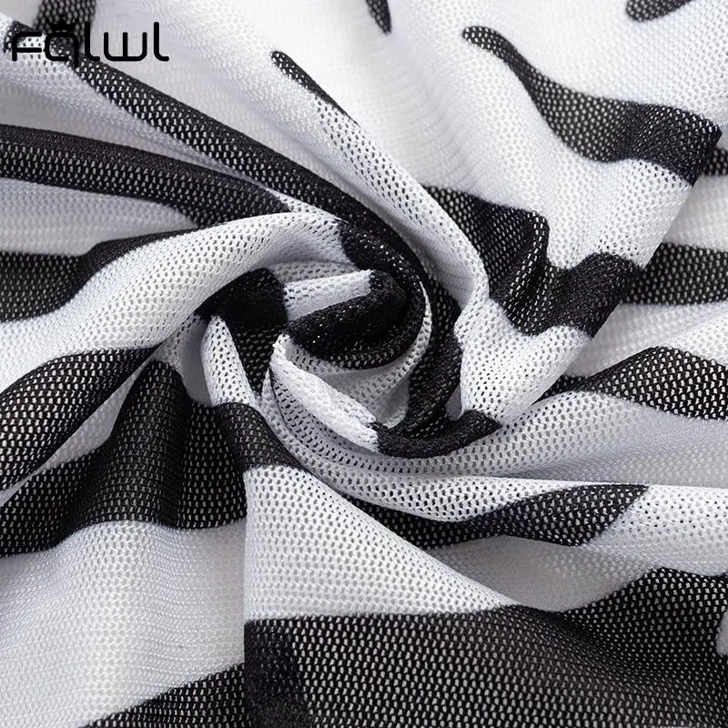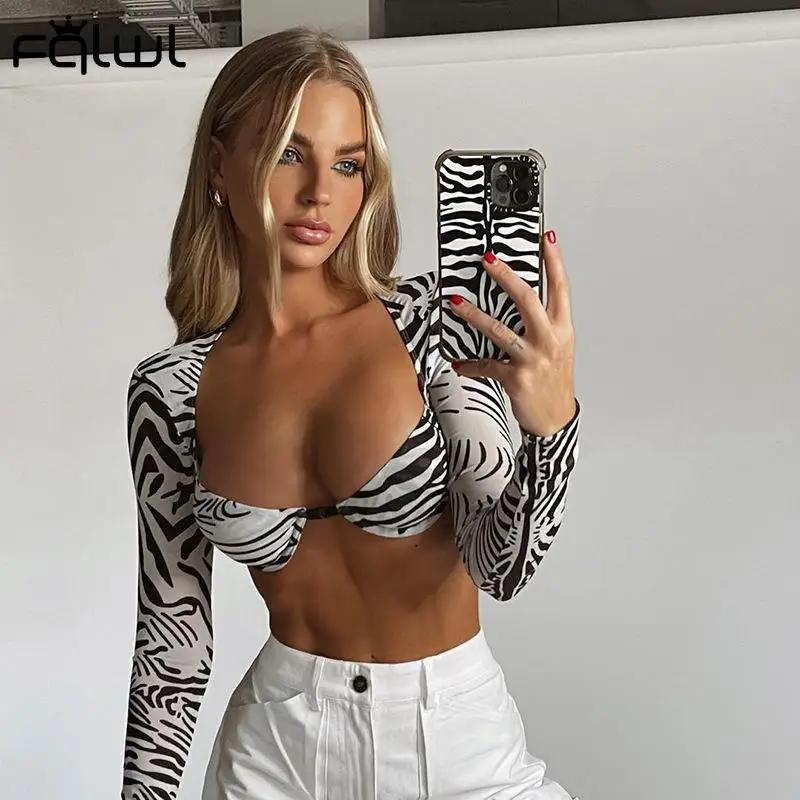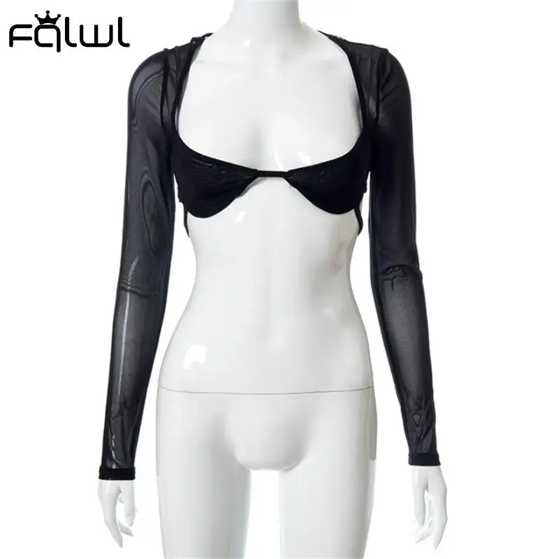 FQLWL летний сексуальный белый черный кроп-Топ для женщин 2021 облегающие Короткие топы с длинным рукавом Женская сетчатая Клубная одежда с принтом модные футболки