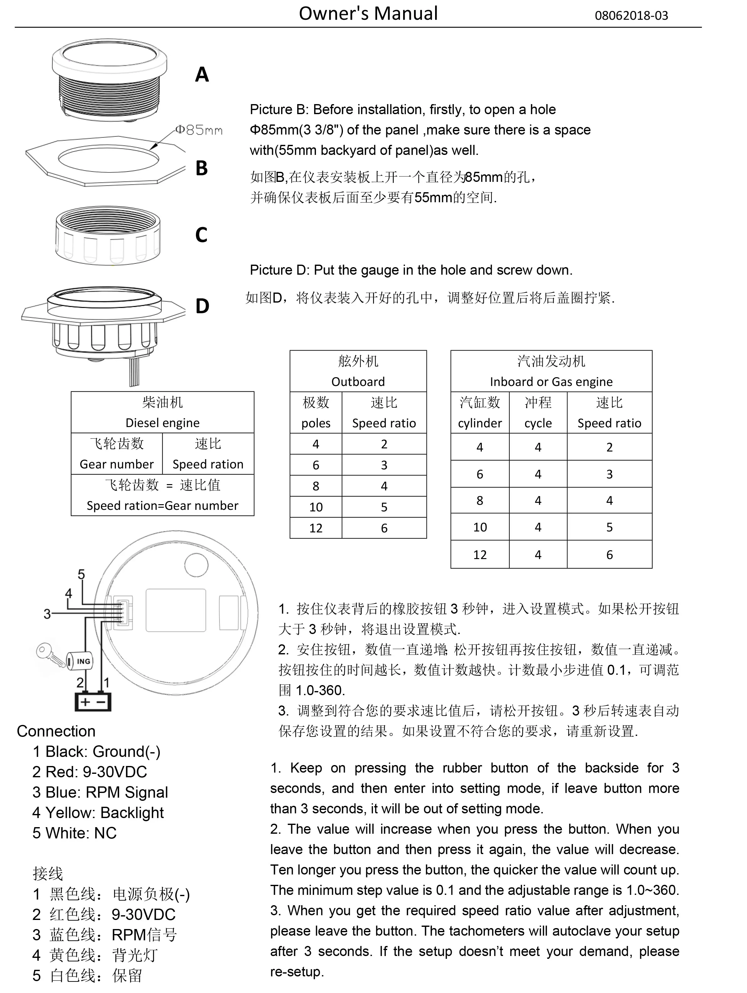 -Диаметр установки: 85 мм-Диапазон отображения: 3000 об/мин/4000 об/мин/6000 об/мин7000 об/мин/8000 об/мин-Напряжение: 12 В/24 В-Рабочий ток: ≤ 100 мА-Коэффициент скорости: 1 ~ 300 регулируемый-Функции: Текущий Тахометр/об/мин и час-Режим работы: ЖК-дисплей, шаговый двигатель-Тахометр подходит для автомобиля/грузовика/лодки/дизельного генератора/бензинового двигателя
