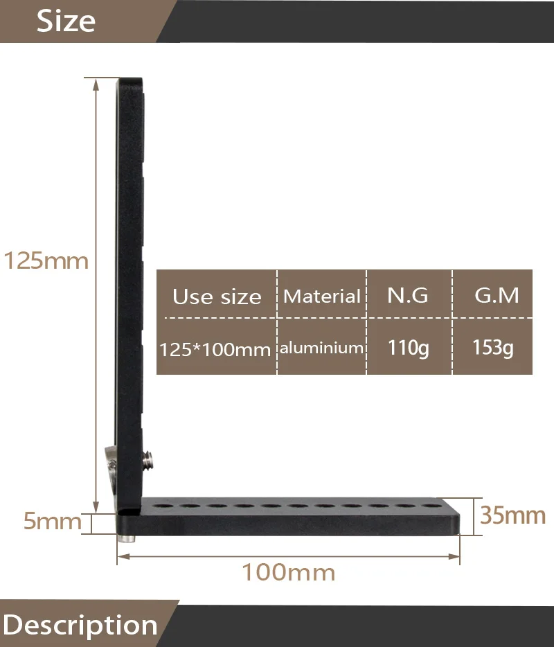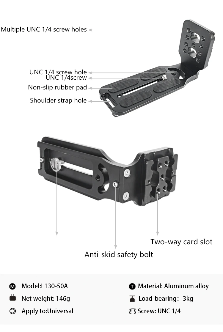Спецификация:Модель: L130-50AМатериал: алюминийВес: 146 гРазмер: см. Страницу с подробной информациейШирина пластины: 38 мм/50 ммТехнология: Анодное окислениеВинт камеры: UNC1/4 винтаПримечание:1. Возможны отклонения в 1-3 мм из-за ручного измерения.2. Из-за разницы в отображении и разсветильник щения изображение может не отображать фактический цвет изделия. Спасибо за понимание.