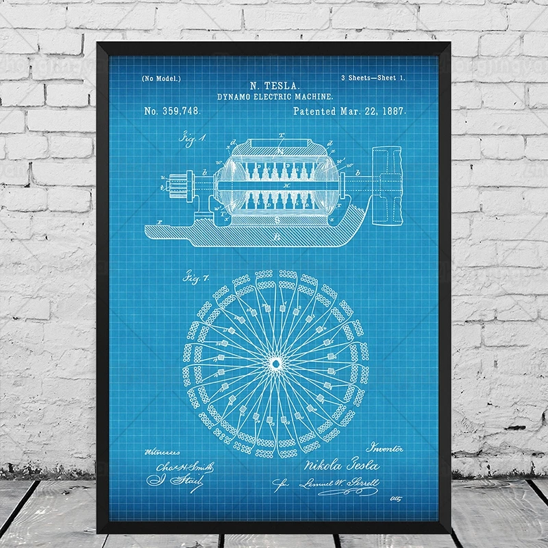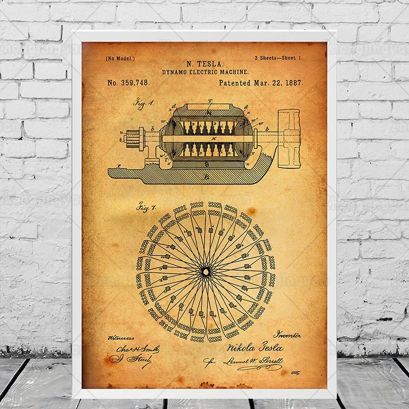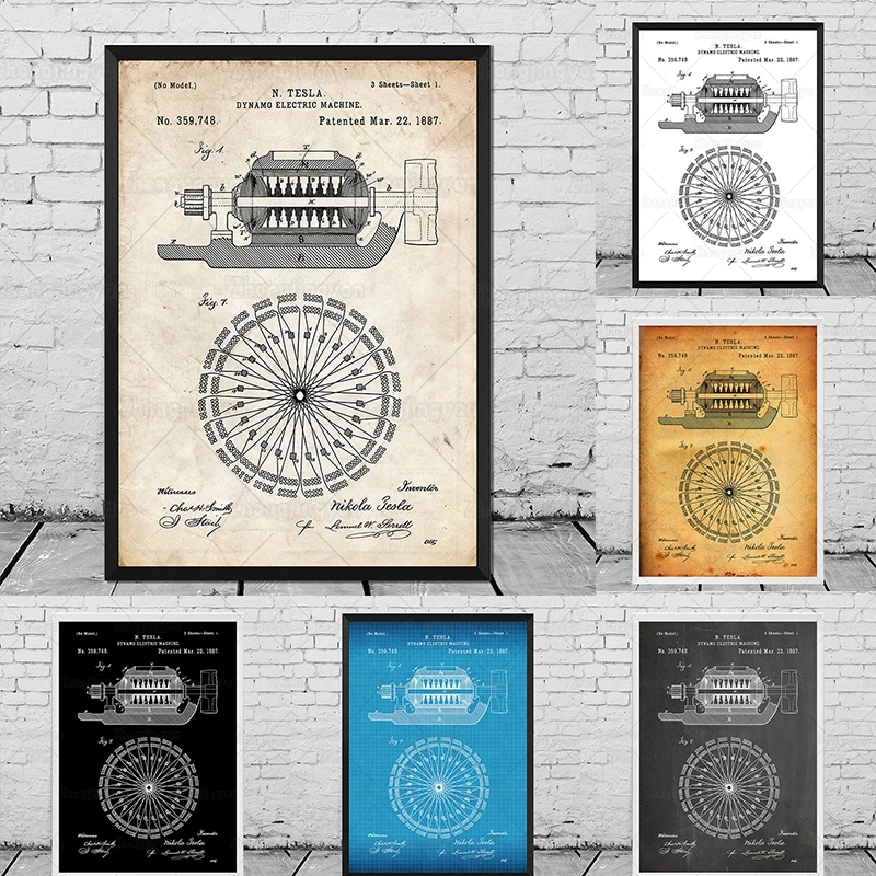Винтажная электрическая машина Tesla Dynamo 1887, патентованная настенная схема, постер, Картина на холсте, HD печать, Настенная картина для домашнего декора