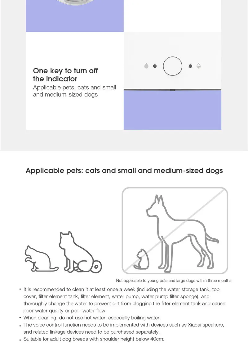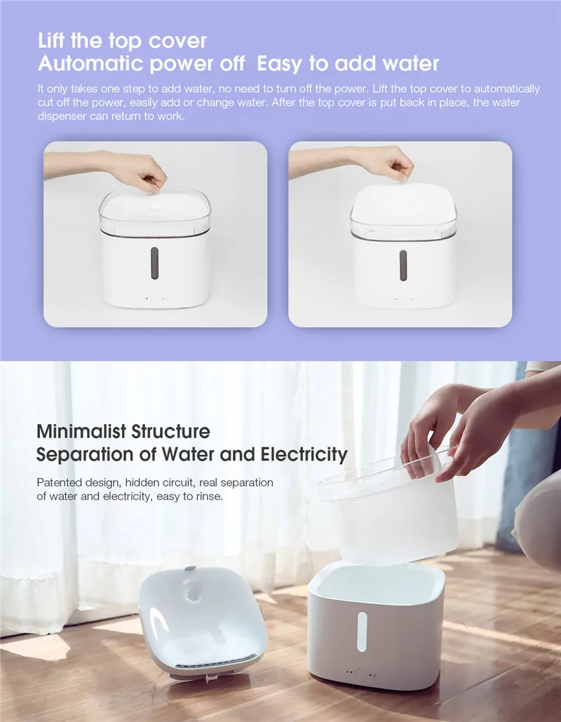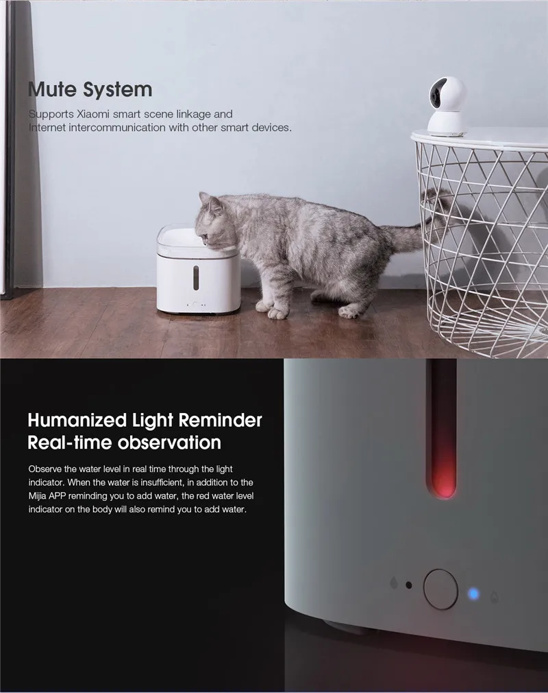 Особенности:-Интеллектуальная связь-Пульт дистанционного управления Mijia APP-Напоминания о человеческом светильник-Легко добавить воду-Запатентованный дизайнСкрытая схема, реальное разделение воды и электричества, легко краску.-Емкость воды 2лХарактеристики:Бренд: Xiaomi MijiaПродукт: умный дозатор воды для домашних животных MijiaМодель продукта: XWWF01MGВходные параметры: 5,9 в 1.0AНоминальная мощность: 5,9 WРазмер продукта: 191x191x177ммЕмкость продукта: 2лВес нетто: 1,3 кгМатериал изделия: корпус/верхняя крышка: ABSРезервуар для хранения воды: PCTGРабочая температура: 0 °C-50 °CРабочая влажность: 10%-80% относительной влажностиМощность Длина шнура: 1,5 мПосылка включает в себя:1 х умный дозатор воды для домашних животных Mijia (вилка CN)