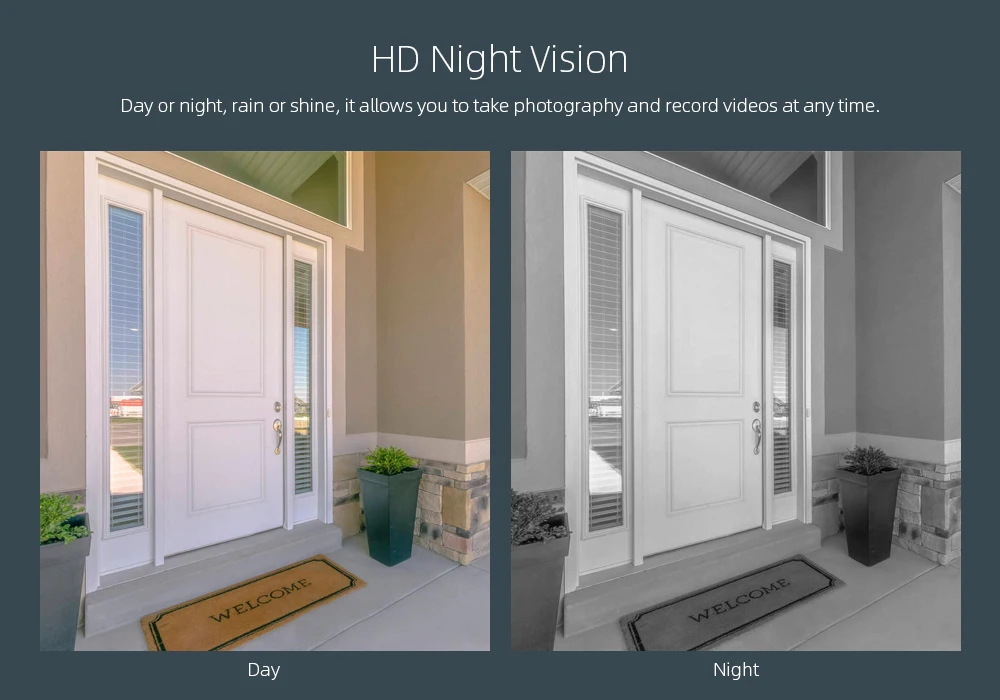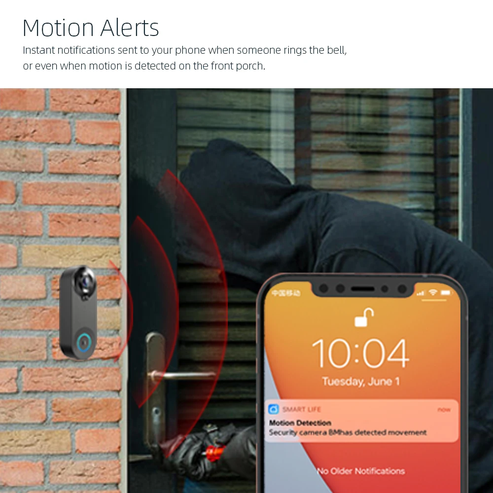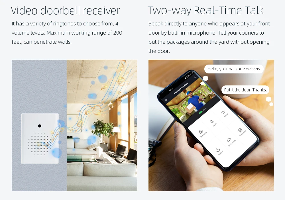 -IP65Сертифицировано для наружного/внутреннего использования-Четкое ночное видение. Обеспечивает мониторинг днем и ночью-Улучшенное Обнаружение движения PIR. Когда дверной звонок обнаруживает движение, приложение будет нажимать уведомление-Интеллектуальное Голосовое управление. Работает с Alexa и Google Assistant (дополнительно).