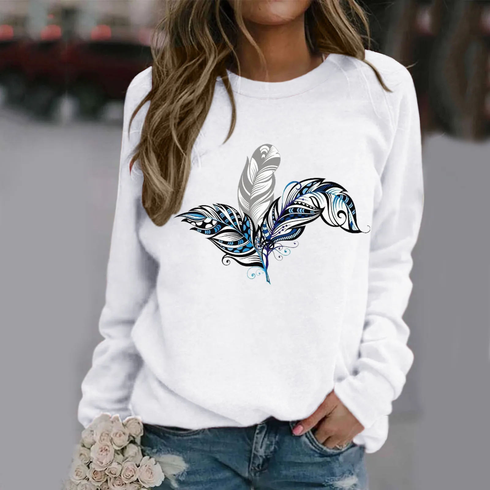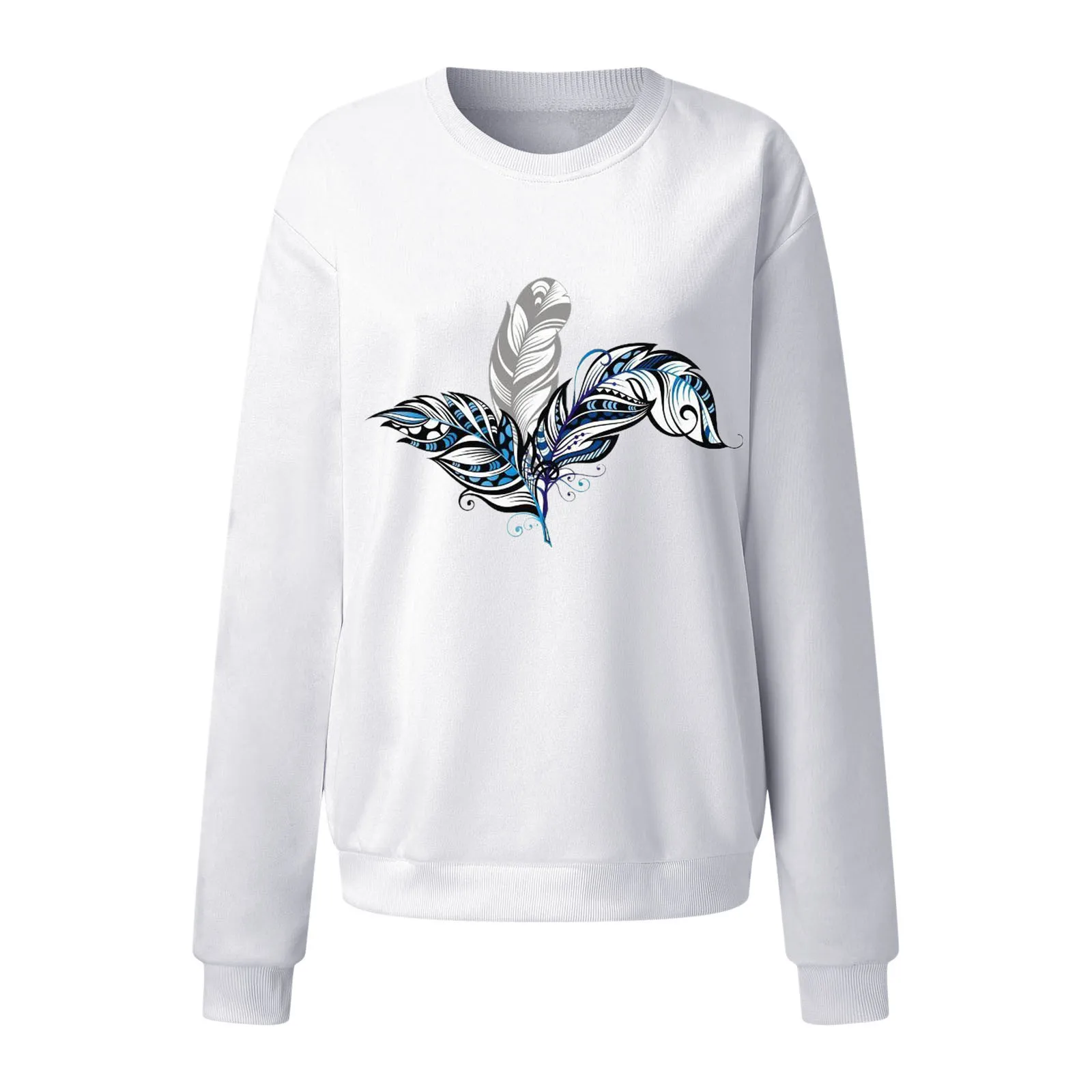 Женский свитшот с длинным рукавом и принтом перьев, Повседневная Блузка, пуловер, джемпер на осень и зиму, топы, Модный классический белый пуловер