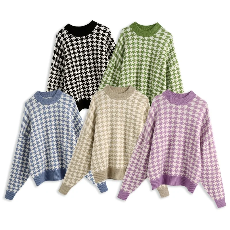 Женский свитер оверсайз, топ в клетку с длинным рукавом, пуловеры, вязаные свитеры в гусиную лапку с круглым вырезом, женский джемпер на осень и зиму