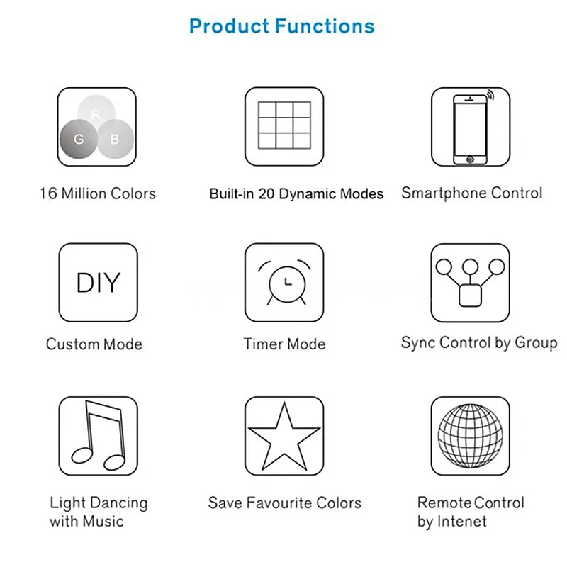 12. Широкий выбор: функция цветного кольца, функция управления музыкой, встроенный динамический режим, пользовательский режим и т. д.
