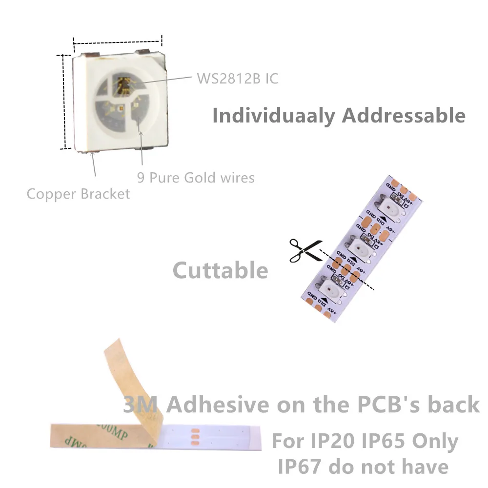 Внимание покупателя: Обратите внимание: белый PCB Черный: Черный PCB IP20: не-водонепроницаемый IP65: водонепроницаемый в силиконовом покрытии IP67: водонепроницаемый в силиконовой трубе длина, как вы выбираете Входное напряжение: DC5v; мощность: 30 светодиодный s/m ---- 9 Вт/метр 60 светодиодный s/m ---- 18 Вт/метр 144 светодиодный s/m ---- 43,2 Вт/метр светодиодный ресурс: WS2812B светодиодный (5050 SMD RGB светодиодный со встроенной улучшенной версией ws2811 ic) Светодиодный: Каждый светодиодный индикатор управляется отдельно, светодиодный IC Тип: улучшенная версия ws2812 IC (встроенный СВЕТОДИОДНЫЙ Индикатор 5050 smd rgb) IC: 1 IC дисков 1 светодиодный чип пикселей: 30/60/144/метр; Шаг: 16,6 мм (1000/64); Серая шкала: 256; Биты/Цвет: 8-бит/цвет; FPC размер: Ширина: 10 мм, высота: 2,5 мм; FPC Цвет: Черный/белый Уровень защиты: IP20 не водонепроницаемый (3 м клейкая лента сзади) IP65 Водонепроницаемый (3 м клейкая лента сзади) IP67 Водонепроницаемый (не имеет 3 м клейкая лента сзади) цвет s: полный Цвет цветная (RGB), сон, Цвет изменение цвета; Посылка: в антистатическую сумку, с 3 м липкой лентой на спине
