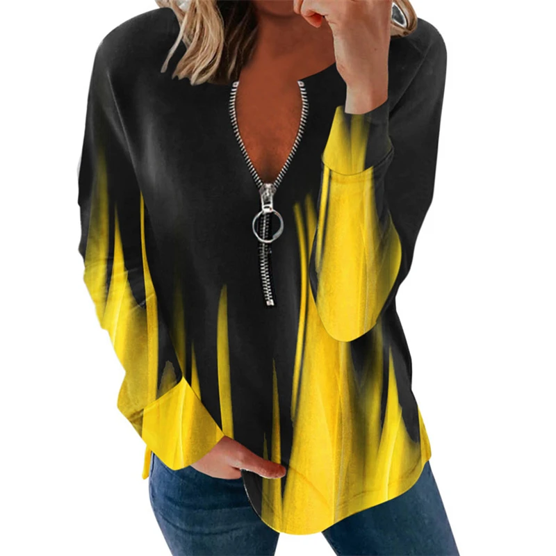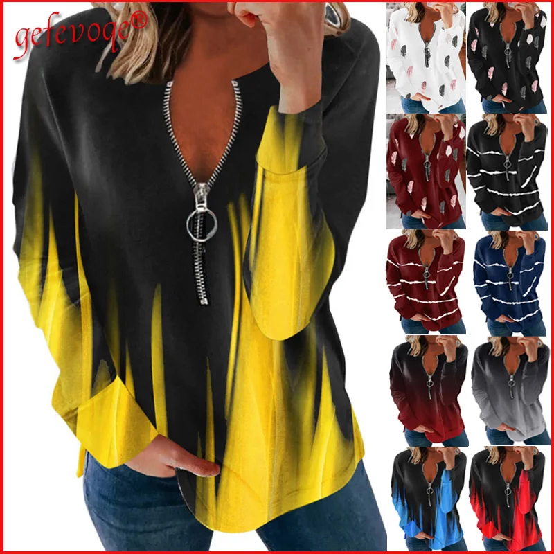 Женская футболка на молнии, Повседневная Свободная футболка с V-обр...