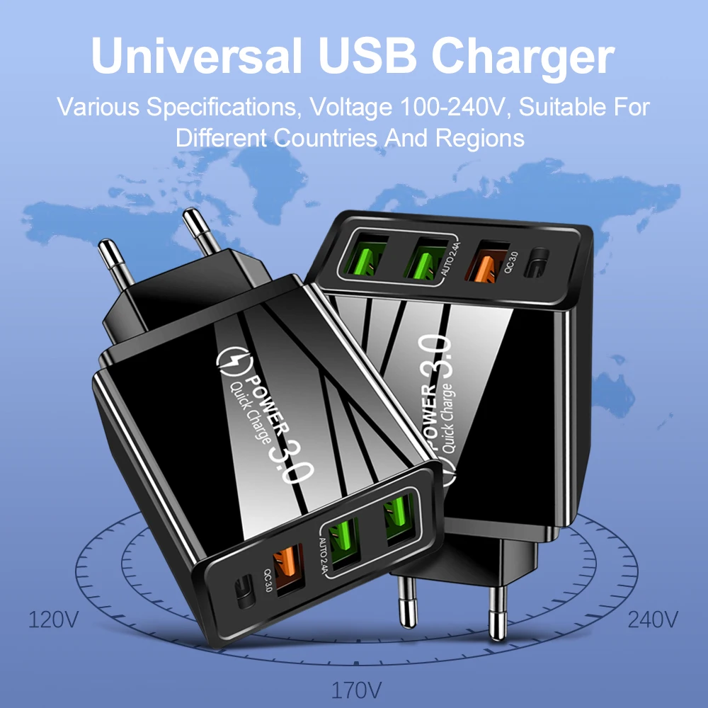 Быстрое зарядное устройство USB 36 Вт, 4 порта, QC3.0, Тип C PD 20 ...