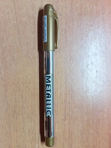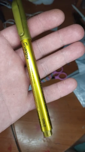 хороший маркер, пишет отлично, смотрится как насыщенный желтый, не особо блестит золотом, линия получается плотно закрашенная, пишет на пластике отлично