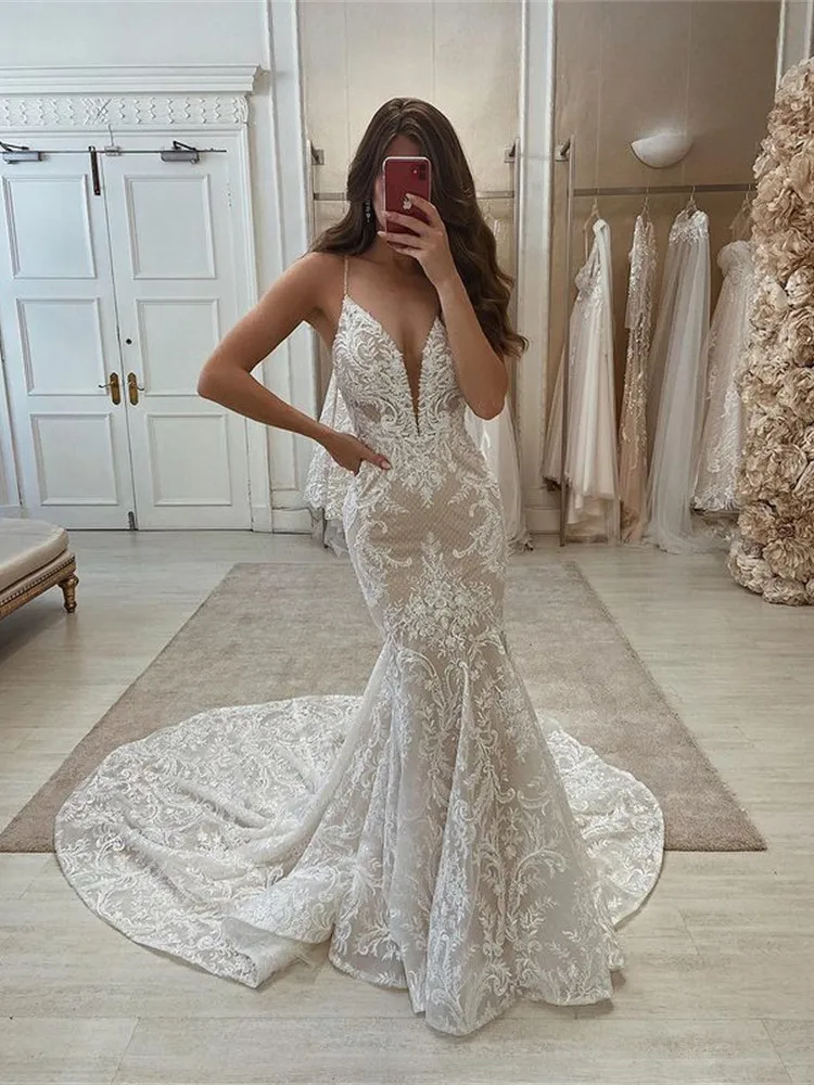 Романтичное кружевное свадебное платье-русалка, новинка 2021, сексуальные свадебные платья на бретелях-спагетти с открытой спиной и шлейфом, свадебное платье