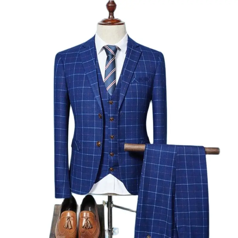 Мужской свадебный комплект из трех предметов, клетчатый синий и сер...