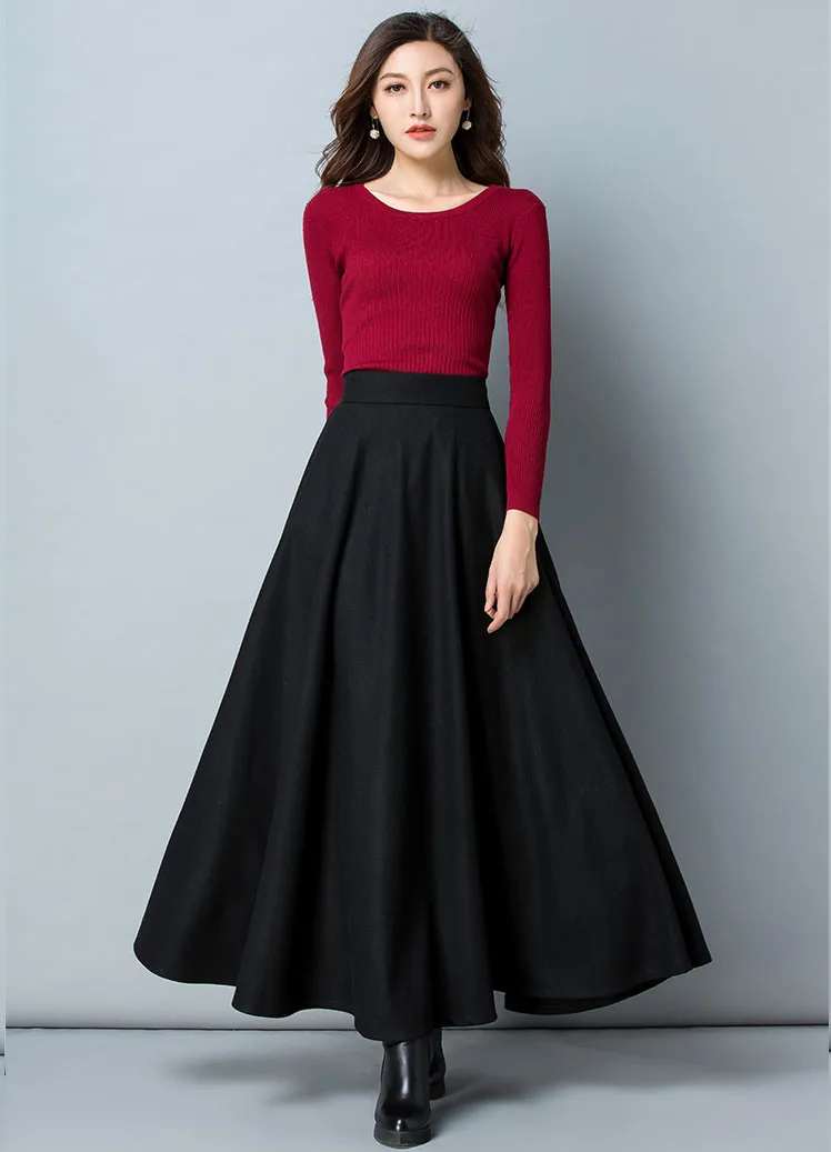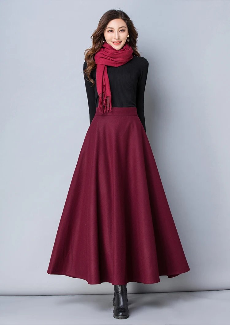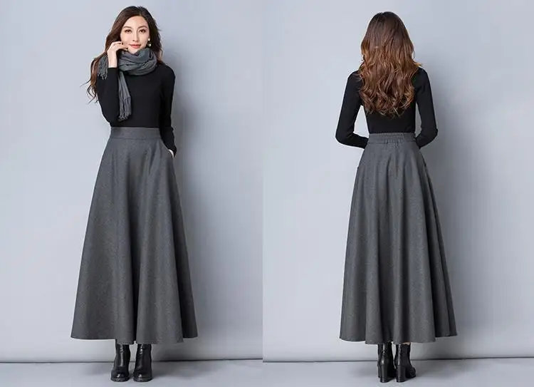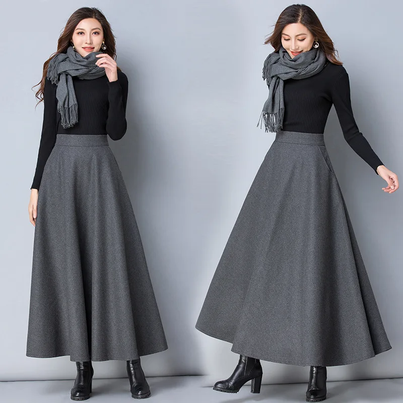Зимняя Длинная шерстяная плиссированная юбка, плотные теплые женские юбки трапециевидной формы с завышенной талией, бордовые, черные, серые