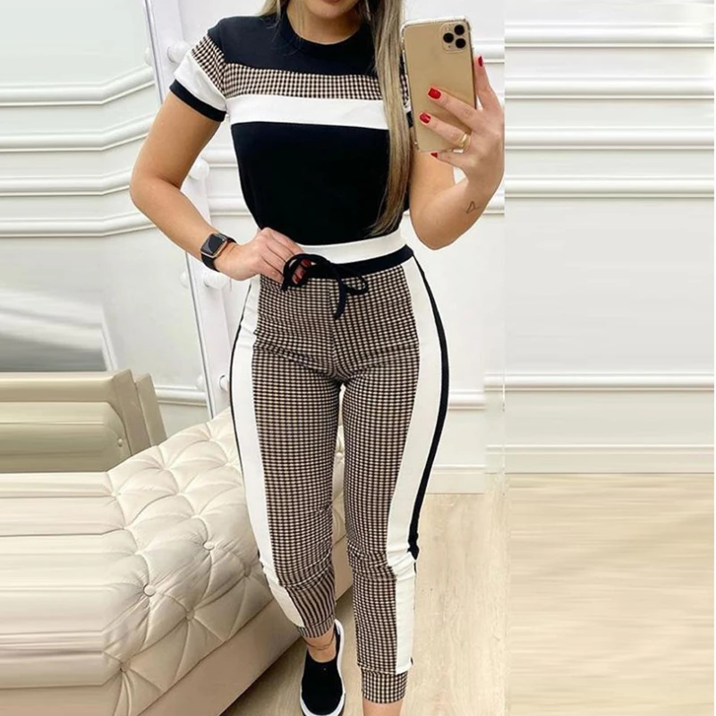 Женский спортивный костюм в клетку с цветными блоками, комплект из двух предметов, летняя и осенняя одежда, пуловер, топ с круглым вырезом и штаны, костюм, уличная одежда, женские комплекты Название ткани: полиэстер Стиль: уличная одежда Рисунок: принт