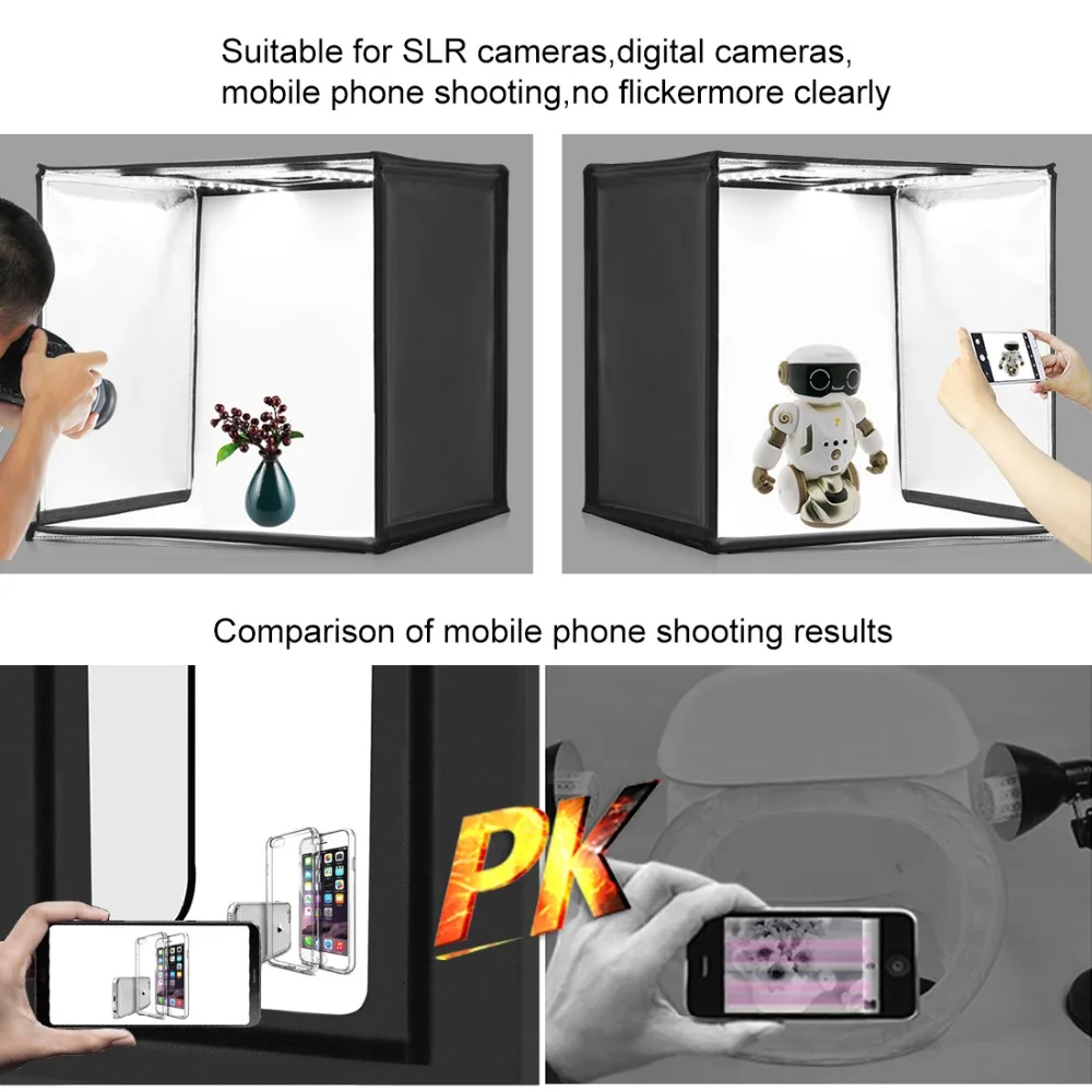 Встроенный в 2 высококачественных светодиодных полосок, фотостудия поможет вам делать высококачественные фотографии, 60 Вт 5500 к светодиодные лампы могут смягчить и отражать свет, устранять блики и пятна для идеальной съемки, вы можете регулировать яркость с помощью источника питания в соответствии с различными элементами, которые вы снимаете