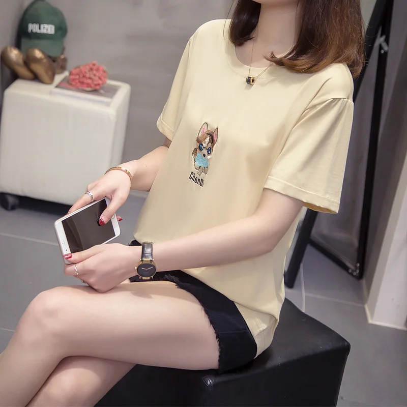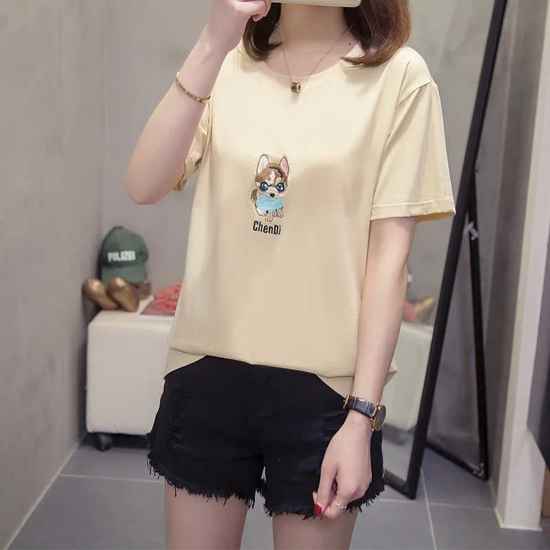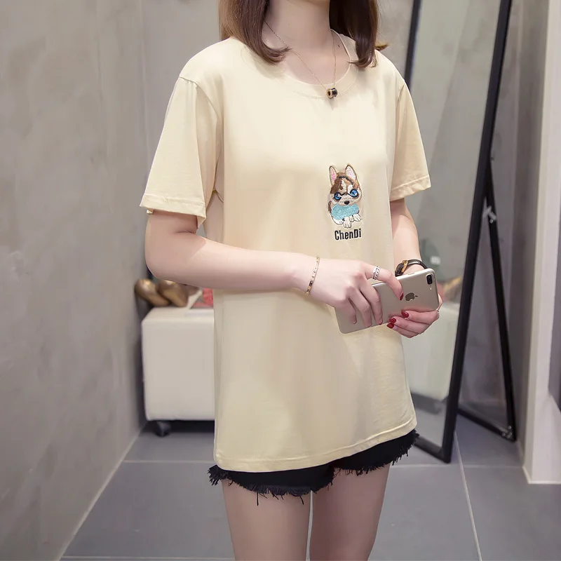 Летние модные новые женские футболки с короткими рукавами с вышивкой в виде собак, свободные, в корейском стиле, повседневные удобные женские топы