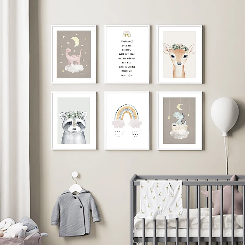 Картина на холсте для детской комнаты, постеры с изображением животных, оленя, медведя, радуга, Настенная картина в скандинавском стиле, украшение для детской комнаты и спальни