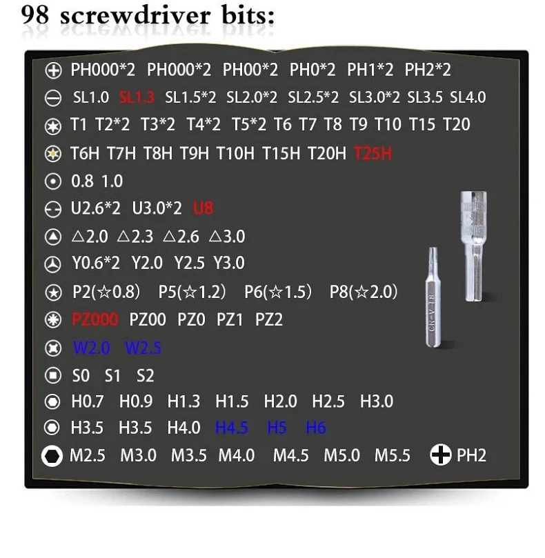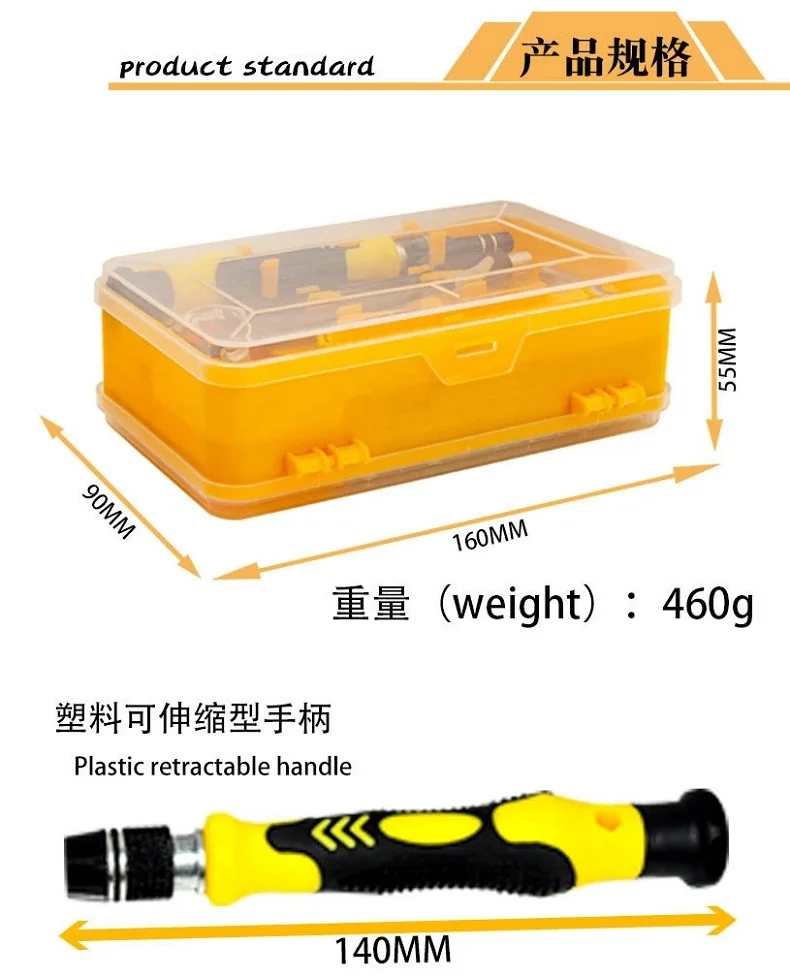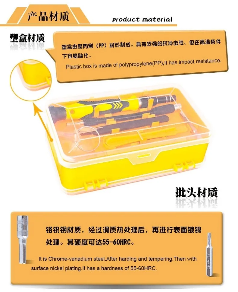 Описание: насадки для винтов и одна отвертка, в посылка вочной коробке с магнетизмом. Простой в эксплуатации, прочный и портативный. Характеристики: Материал ручки: насадки из алюминиевого сплава Материал: сталь CR-V Материал коробки: синтетический пластик Вес: Приблизительно. 600-650 г