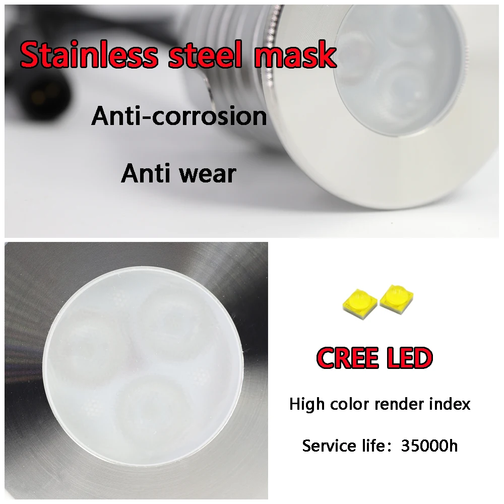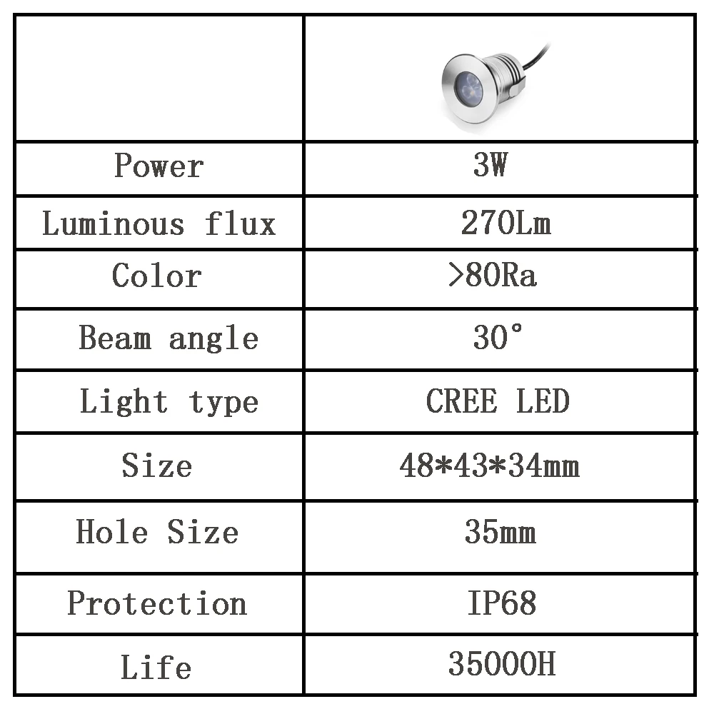 Мощность: 3 Вт CREE-XBD светодиодныйЛюмен: 280 лмВходное напряжение: AC/DC12V-DC24VКласс защиты: IP 68Основной материал: верхняя сторона (нержавеющая сталь), корпус (6063 алюминий)Размер корпуса: d48мм x44ммРабочая температура: -25 °C ~ + 45 °CКабель: DC12V с водонепроницаемым клеммом 36 смГарантия: 3 года с CE и ROHS, срок службы чипа 35 000 часовЦветовая температура: теплый белый (2700-3000K), натуральный белый (4000-4500K), холодный белый (6000-6500K)Использование: светильник для бассейна, фонтанный светильник, светильник для пешеходных дорожек, садовый светильник, светильник для мостов и другой уличный светильник Venus