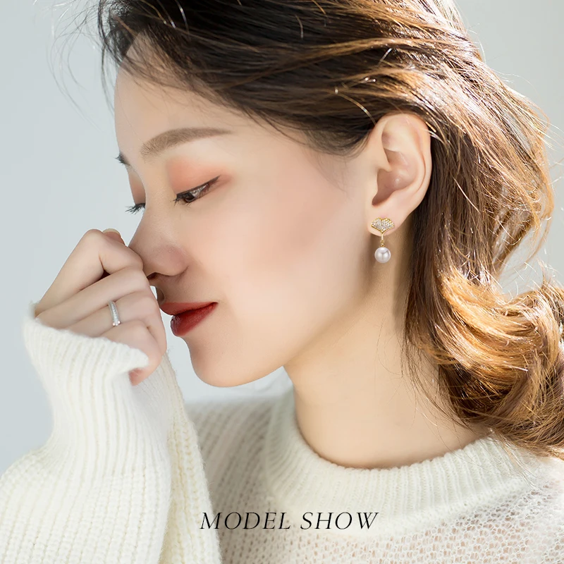 Серьги-гвоздики женские с жемчугом и листьями гинкго