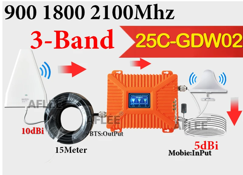 C. 25C-GDW02 = 900 1800 2100 МГц трехполосный усилитель сигнала+ 10dBi LPDA антенна наружная антенна+ 5dBi внутренняя сигнальная антенна потолочная антенна+ 15 метров 50Om кабель+ Руководство на английском языке;