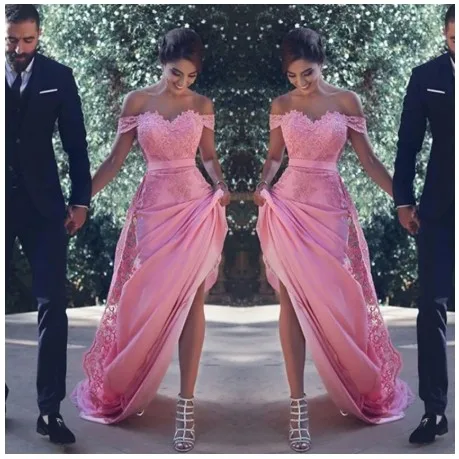 Платье длинное с открытыми плечами для подружки невесты, пикантное ТРАПЕЦИЕВИДНОЕ свадебное платье с кружевной аппликацией, розовое платье для подружки невесты