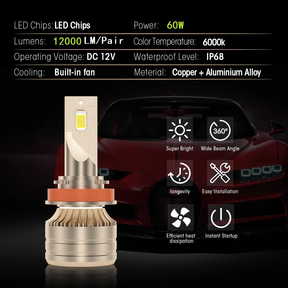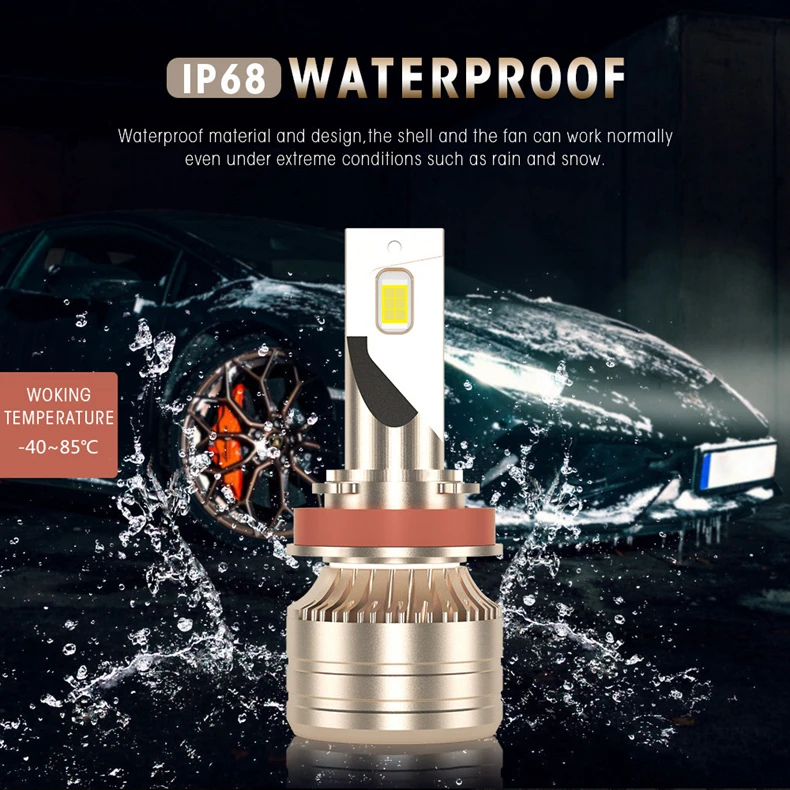 Срок службы: 30 000 часовГарантия: 2 годаВодонепроницаемость: IP68Система охлаждения: алюминий + турбо вентиляторРабочая температура: -40 градусов-+ 85 градусовПрименение: Автомобильный светильник, противотуманный светильник