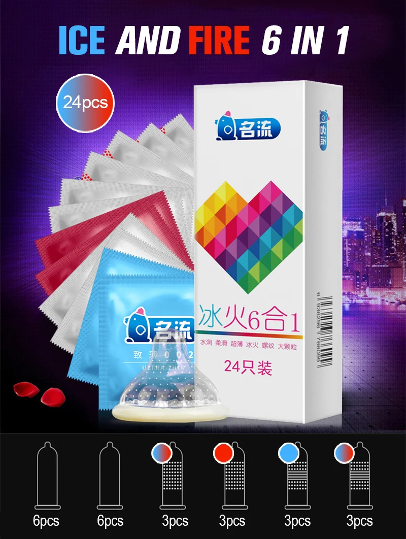 PERSONAGE 24 шт. 6 в 1 презервативы Ice Fire ребристый точечный ст...