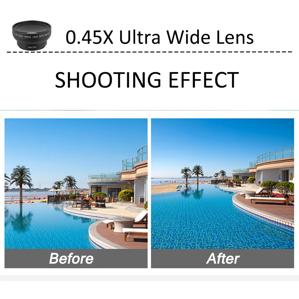 1 * 0.45X HD широкоугольный объектив1 * 12.5X макрообъектив1 * Универсальный зажим1 * Верхняя крышка объектива1 * Нижняя крышка объектива1 * упаковка кожаная сумка1 * упаковочная коробка