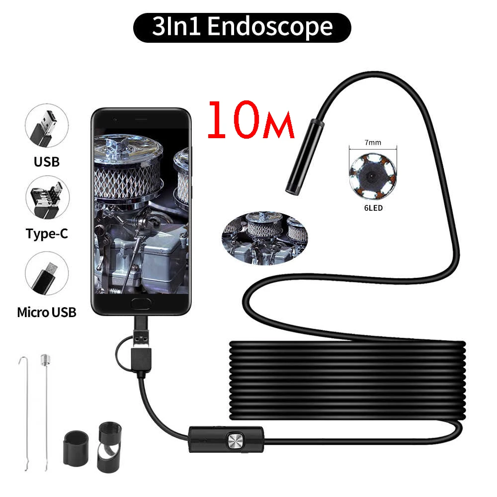 Камера-Эндоскоп 7 мм, Micro USB, OTG, Type C, 6 Регулируемых светод...
