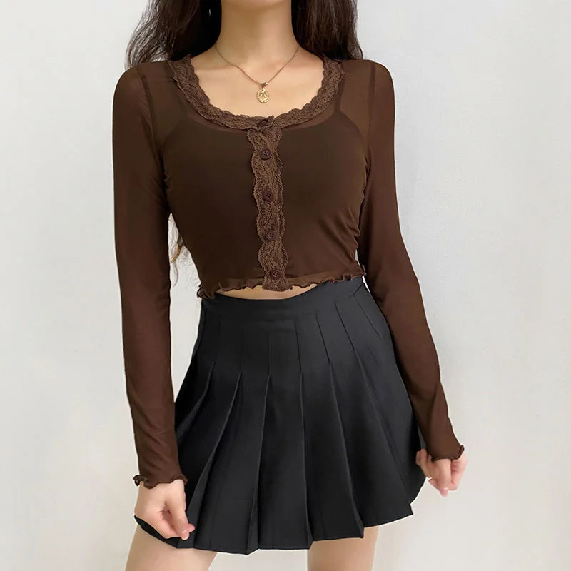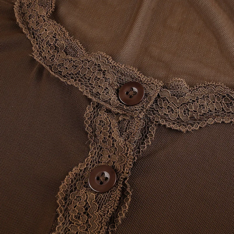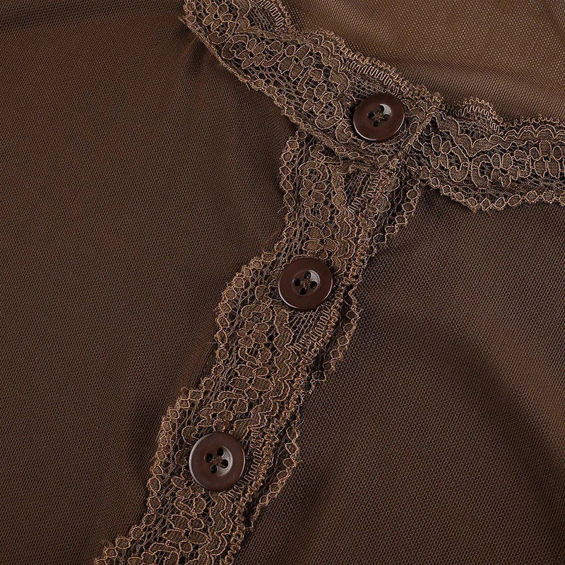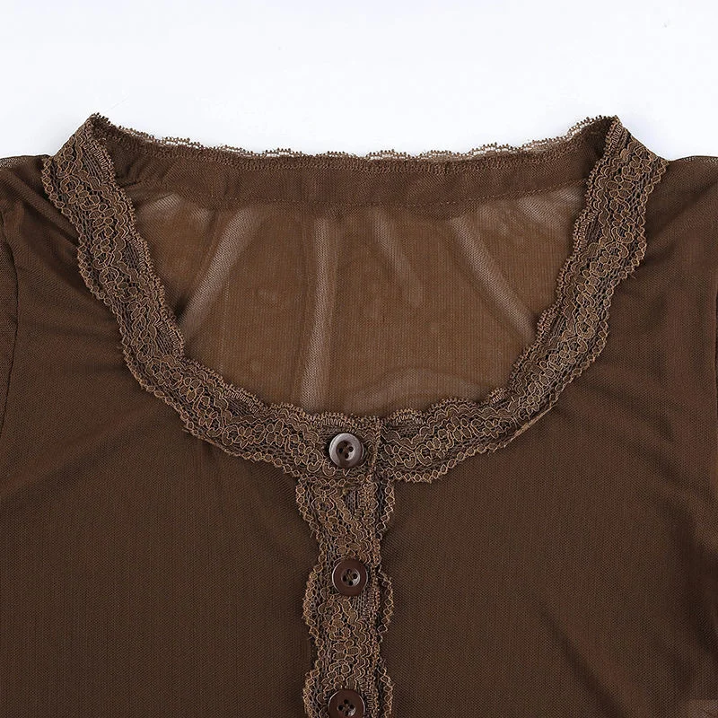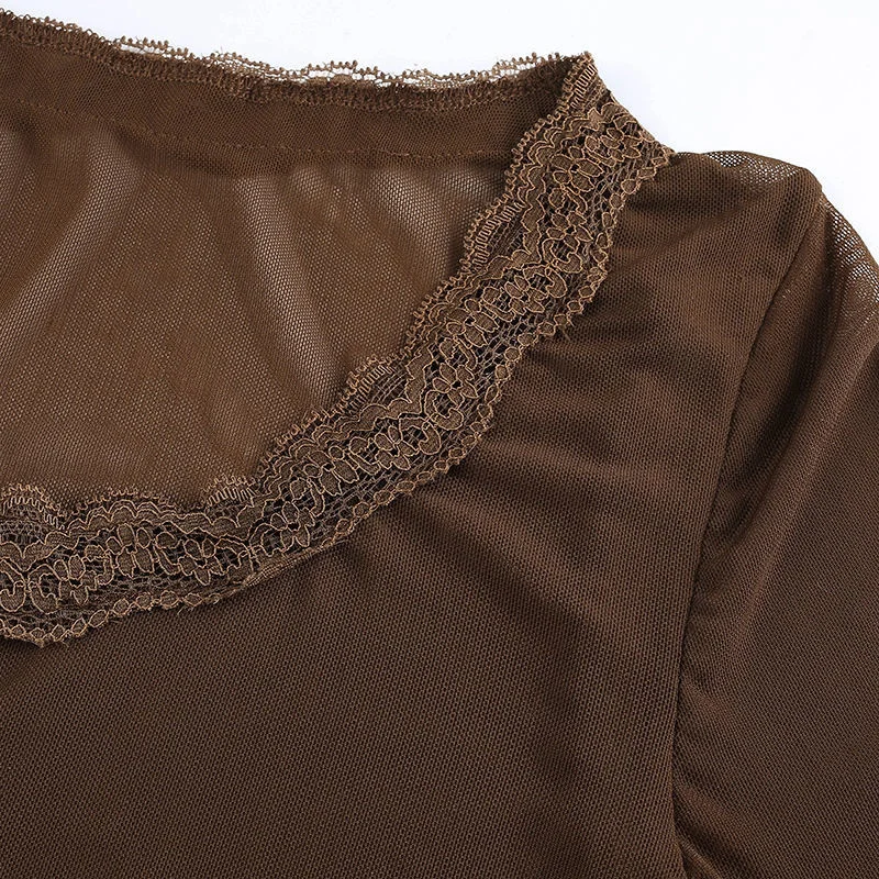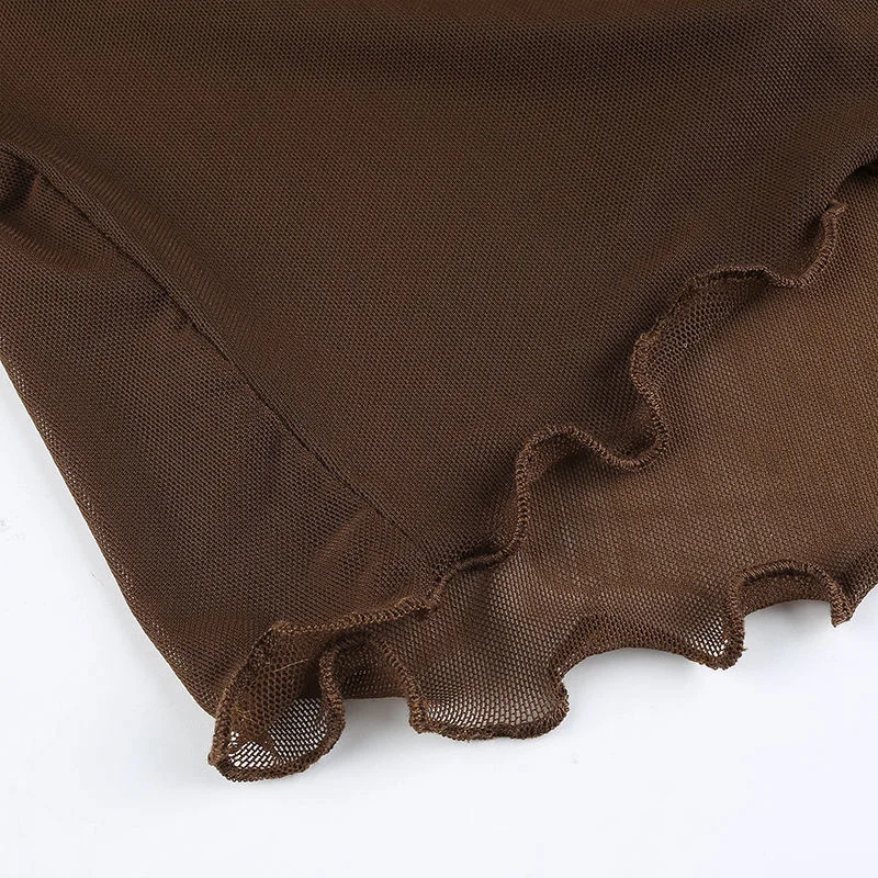 Y2K EGIRL Винтаж оборки сетка коричневые футболки 90s в уличном сти...