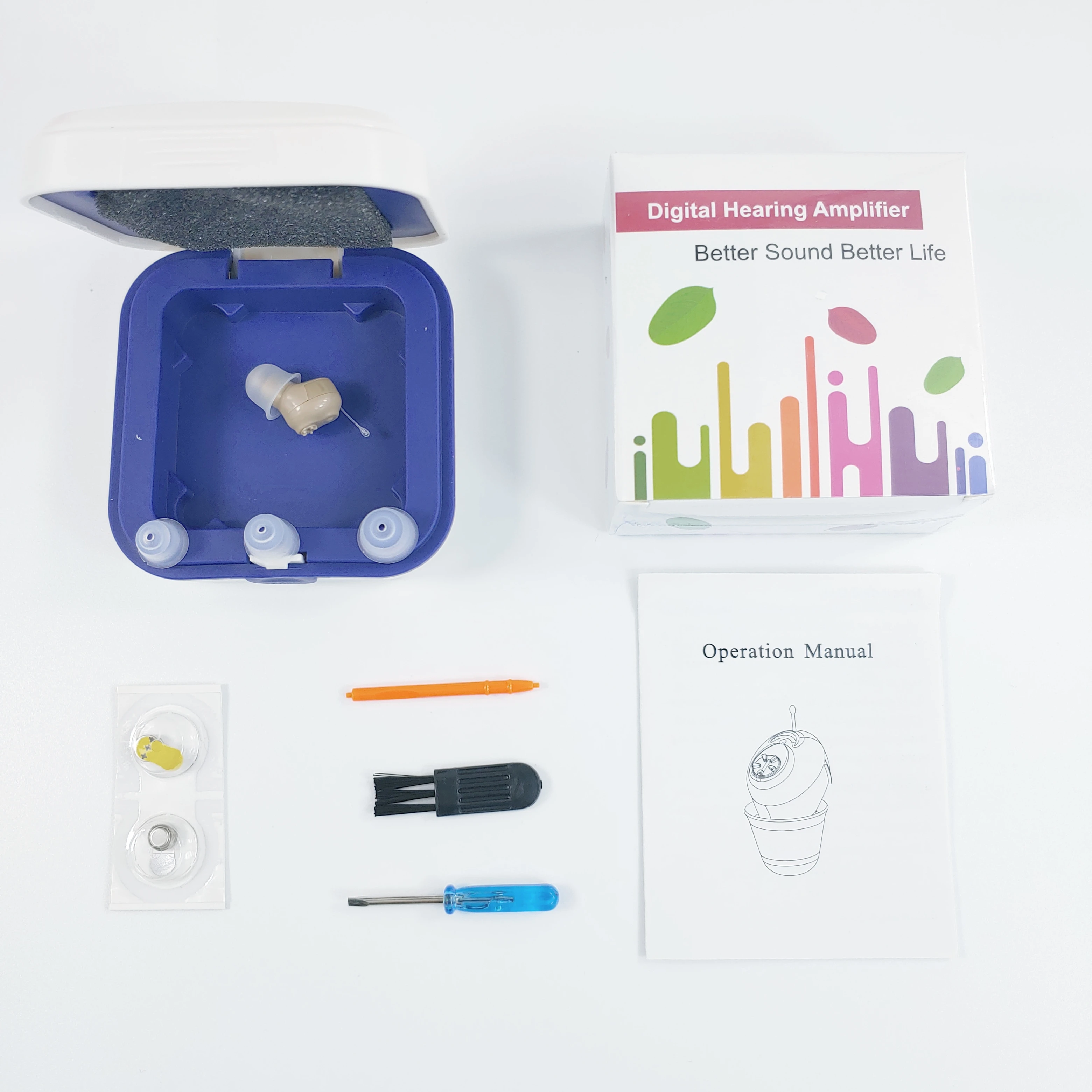Особенности1. Пиковое усиление (дБ): 30 дБ, подходит для легкой и средней потери слуха (справочная карта потери слуха)2. Супер Мини Размер: размер ушной помощи из уха только 0,659*0,0.4*0,23 дюймов, вес всего 1 г, который может быть хорошо спрятан в ушах.3. Биомиметическая конструкция: предназначена для ослабления слуха, более подходящего слухового канала. Не ощущайте боли даже при длительном ношении.4. Долгое время работы: Один аккумулятор A10 может работать около 60 часов. Удобный и практичный.5. Если купол уха не полностью заполняется в ушной канал или пропускает воздух в ушной купол, что вызовет раздражающий свисток. Мы даем 3 различных размера затычек для ушей, чтобы уменьшить завывание и шум.6. Подарок в комплекте: мы дадим коробку слухового аппарата для переноски. Каждый набор содержит подходящую батарею, наушники и чистящую щетку и т. д. будет отличным подарком для ваших друзей или семьи.Параметры продуктаПик OSPL 90 (дБ SPL): 110 дБHAF OSPL 90 ( dB SPL): 105 дБПиковый коэффициент усиления (дБ) : 30 дБHAF/коэффициент усиления тумана (дБ) : 26 дБЧастотный диапазон (Гц) : 500-4500 ГцИскажение: 500 Гц: 5%800 Гц: 3%1600 Гц: 3%ПараметрыНазвание продукта: CIC слуховой аппаратЦвет: синий/бежевыйБатарея: батарея A10Вес: Всего 82 гПосылка в комплекте1 × слуховой аппарат1 × коробка для хранения3 × наушники (разные размеры)2 × подходящая батарея (A10)1 × Щетка Для Чистки слухового аппарата1 × Кронштейн регулировки громкости1 × инструкции(Перед использованием убедитесь, что прочитали инструкцию).Инструкции1. Перед использованием очистите ушной канал.2. Вставьте аккумулятор.3. При первом использовании, пожалуйста, поверните громкость до минимального, а затем медленно Увеличьте.4. Попробуйте и выберите подходящий купол уха. Установите купол уха и убедитесь, что он плотно прилегает.5. Вставьте слуховой аппарат в ушной канал, отрегулируйте его положение в ушном канале до полного раскрытия мягкого наушника и заполните ушной канал.