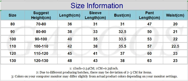 1 см = 0,39 дюймов.1. Если ваш ребенок пухленький, мы рекомендуем выбрать больший размер. Пожалуйста, обратитесь к вашим детямРост и Таблица размеровПеред покупкой/торгами. Спасибо.