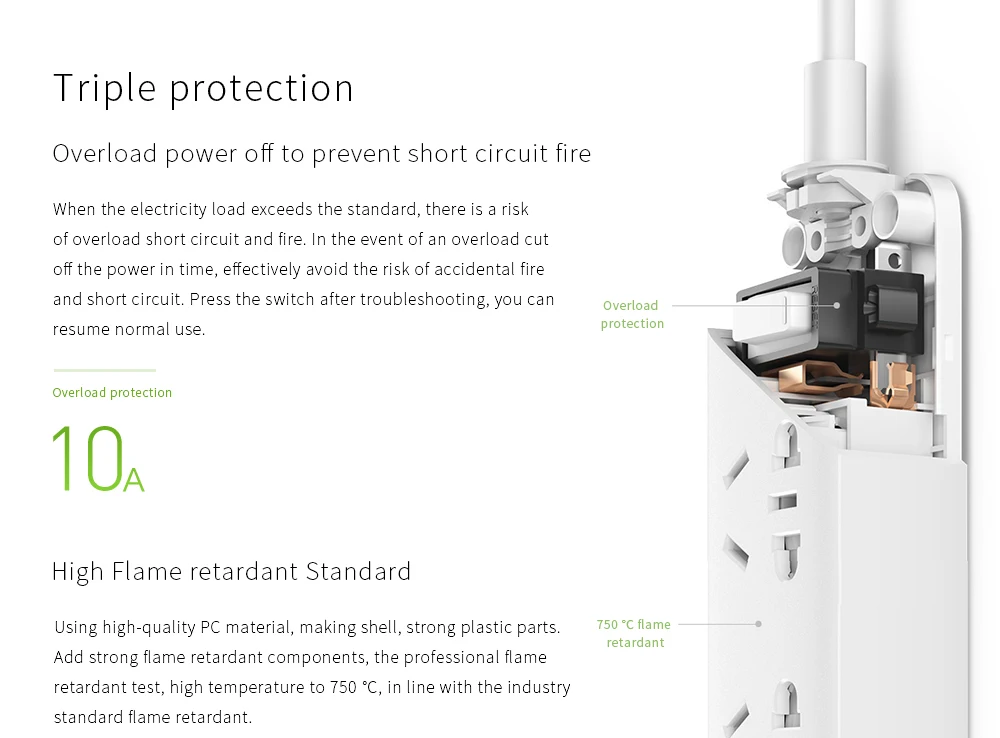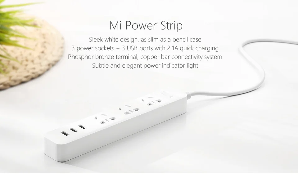 ФункцияБлок питания XiaoMi с гладким белым дизайном, тонкий, как карандаш case3 розетки питания и 3 USB порта, и поддержка быстрой зарядки 2AФосфорная бронзовая Клемма, система подключения Медного СтержняНезависимые защитные двери для защиты детей от риска поражения электрическим токомТонкий и элегантный белый индикатор питания Светильник показывает рабочее состояниеКоэффициент конверсии высокой мощности до 82 процентовПорог защиты от утечки 20uAВысокий огнестойкий стандарт до 750 градусов по Цельсию250 в полный диапазон напряженияПрошел Пробный тест (5000 раз)Нескользящие подушечки на четырех ножкахШлифовка верхней поверхности глазури и зеркальная полировка на боковой поверхностиПриятный внешний вид и простой для домашнего использования и украшенияТехнические характеристики