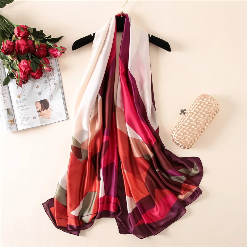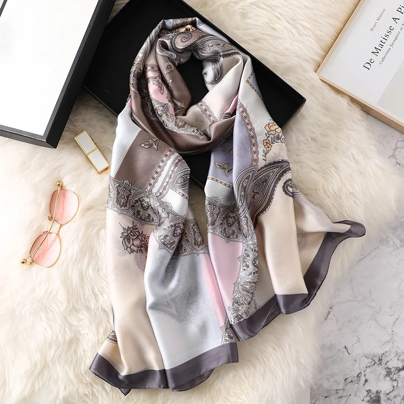 Роскошный брендовый женский шелковый шарф на весну и осень, элегантные длинные шали, палантины, блестящий платок с принтом-хиджаб, Пляжная бандана