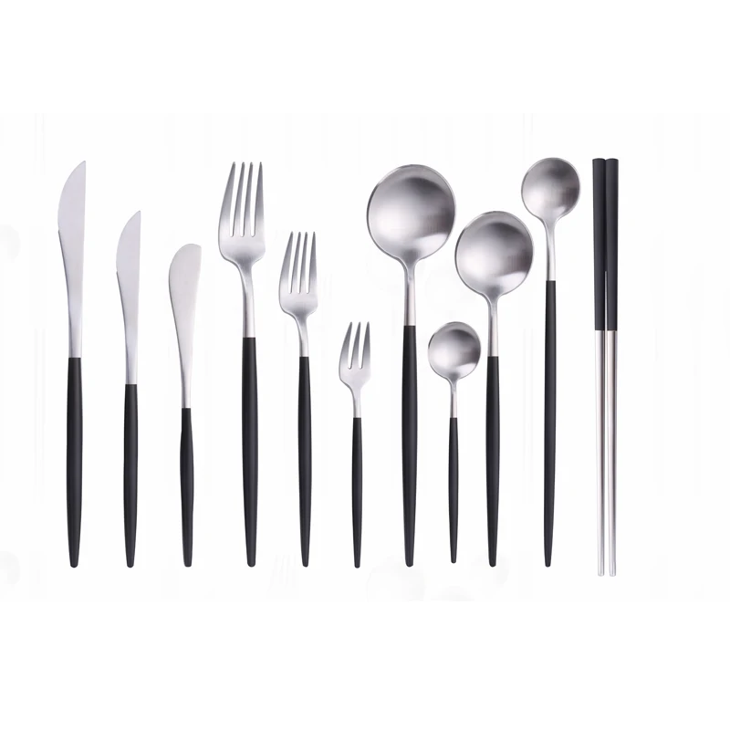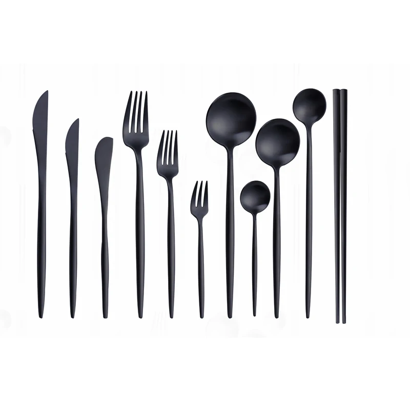 Матовая черная посуда, набор столовых приборов из нержавеющей стали, вилки, ножи, ложки, палочки для еды, набор столовых приборов, полный черный набор посуды