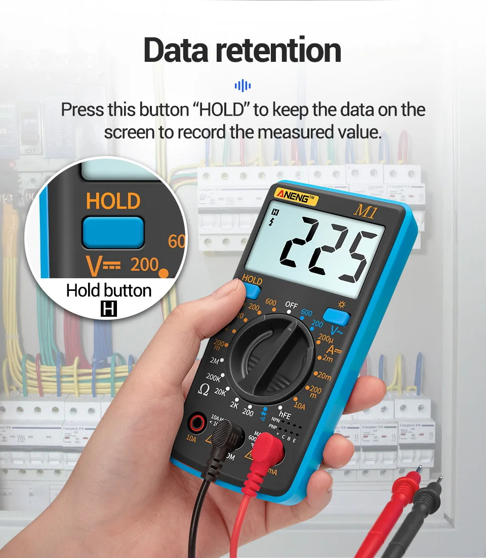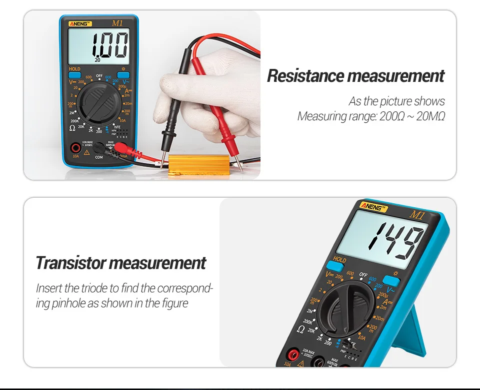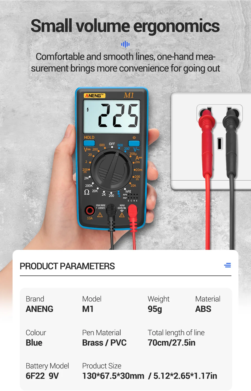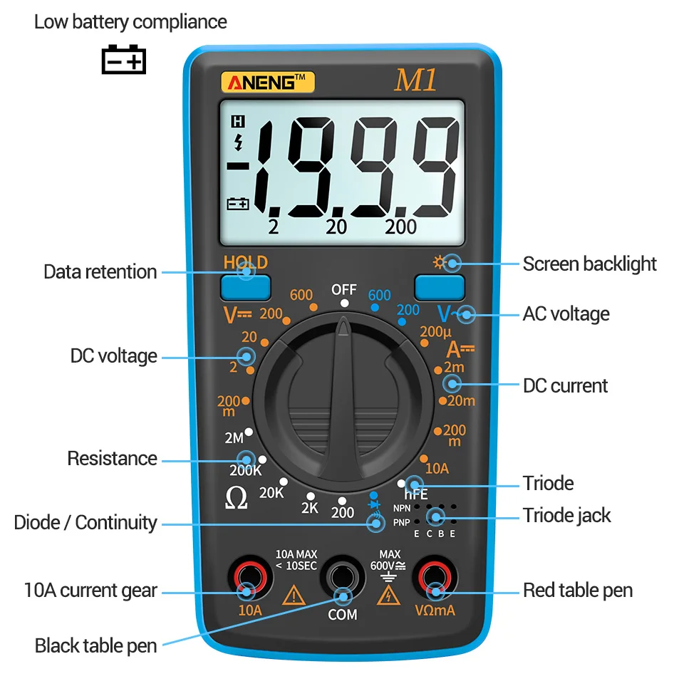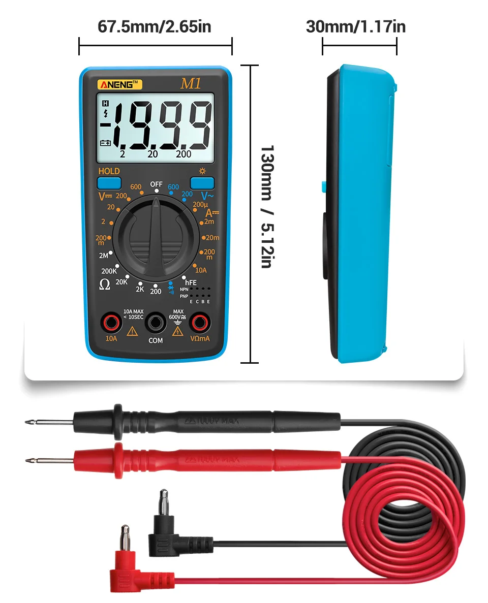 Особенности:Цифровой ЖК-экран, максимальное значение дисплея 1999.Мультиметр имеет четкий, легко читаемый ЖК-дисплей, белый задний светильник.Портативный и компактный дизайн.Хранение данных.Отображение символа низкого напряжения.Фоновый светильник.Защита от перегрузки n.Пройденное измерение.Диод: ДаАудио: ДаИзмерение прохода: ДаХранение данных: ДаФоновый светильник: ДаМаксимальный дисплей: 1999Спецификация:Напряжение постоянного тока: 200мВ-2-20-2000-600в плюс или минус 0.5%Напряжение переменного тока: 200-600 в плюс или минус 1.0%Ток постоянного тока: 2 м-20 м-200 м-10A + 1.8%Сопротивление: 200-2-20 k до 200 k, 2 k m Ω plus или минус 1.0%Измерение температуры: термопара типа K, - 20 ℃ ~ 1300 ℃ (+ / - 3%)Измерение триода: (PNP/NPN Triode hFE)Измерение диода: ДаТест на прохождение: ДаВходное сопротивление: 1 м ΩЭлектрическая бассейн элемент питания: 9V, 6F22 (Батарея-это не прилагаются)Максимальный дисплей: 1999 (3 полужидкокристаллических дисплея)Размер дисплея: 45x18 ммПосылка включает в себя:Цифровой мультиметр ANENG AN8205C (аккумулятор не входит в комплект)-1 шт.2 x пара электронных зонда1 x Руководство пользователя