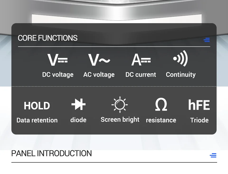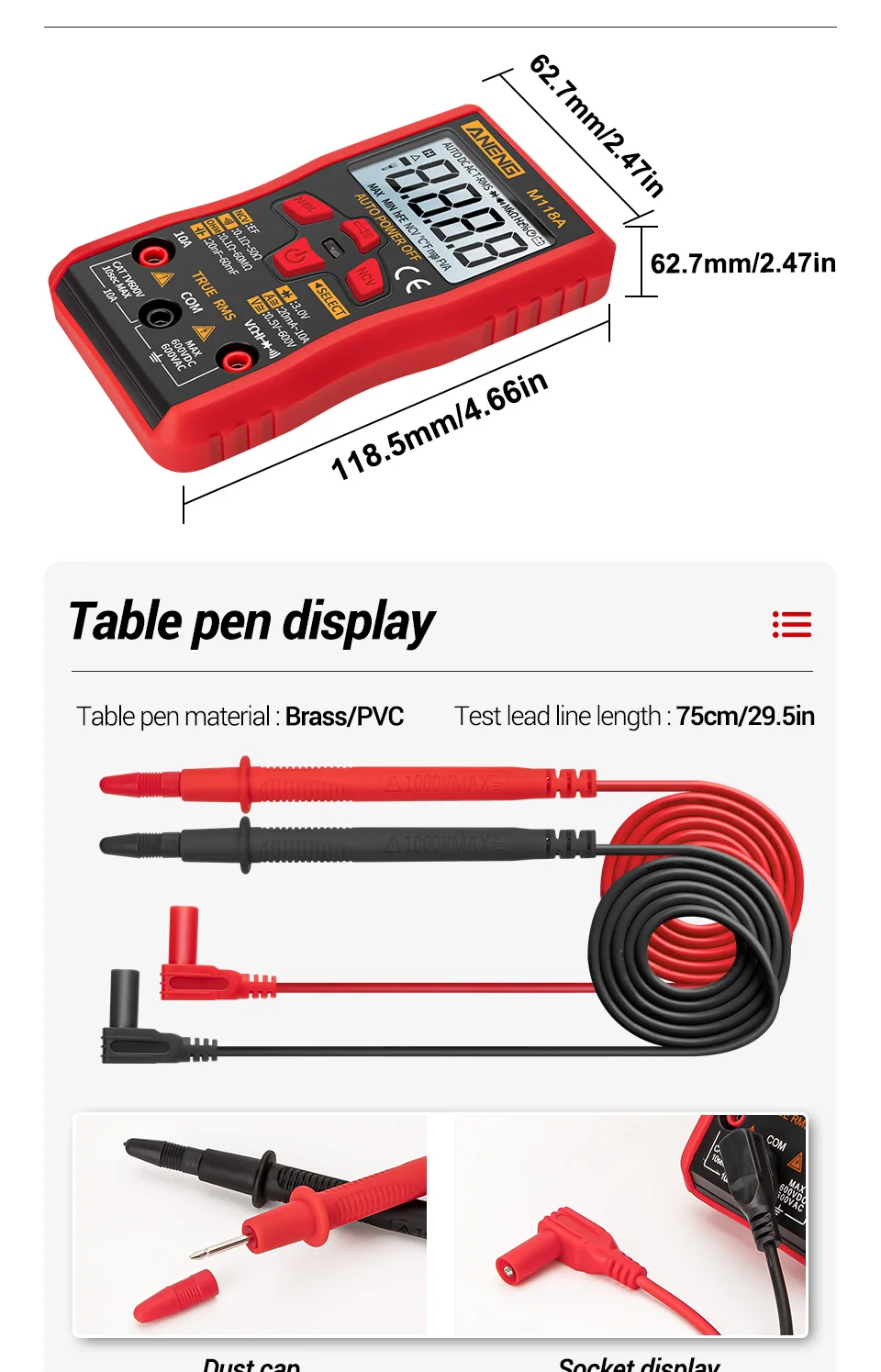 M118A-это 6000 единиц карманного типа, 3 5/6 цифр, истинное эффективное значение, автоматическое сканирование цифрового метра.M118A автоматически распознает и измеряет в зависимости от входного напряжения/тока/сопротивления/и т. Д. Сигналы.M118A имеет характеристики стабильной работы, высокой точности и четкого чтения.M118A также имеет дополнительные удобные функции фонарика и бесконтактного теста напряжения,M118A является идеальным инструментом и инструментом, подходящим для заводов, обучающих и электронных энтузиастов.