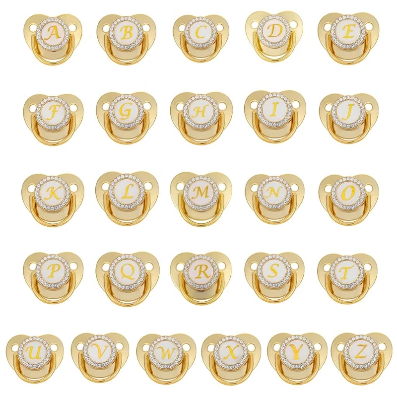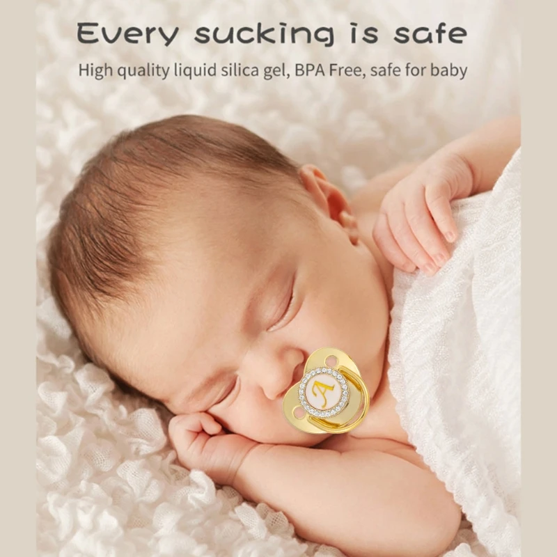 100% новый и высокое качествоСпецификация:Материал: пластик + жидкий силиконРазмер: app.5.2x4.7cm/2.05x1.85inНиппельная головка: app.3.2x1.8cm/1.26x0.71inПодходит для детей 6-18 месяцевЦвет: ЗолотойДополнительный Стиль: A, B, C, D, E, F, G, H, I, J, K, L, M, N ,O, P, Q, R, S, T, U, V, W, X, Y, ZКоличество: 1 шт.Изготовлен из пищевого материала, без запаха, без BPA, безопасен для ребенка.Хрустальные стразы на соске очень сверкающие и великолепные, что привлечет внимание ребенка.Ультра-мягкая силиконовая соска, хороший сосательный вкус для естественного развития полости рта, уважает естественное развитие зубов и десен ребенка. Помогает успокоить спокойное настроение ребенка.Легко моется, нет лапок и трещин для микробов, чтобы спрятаться.