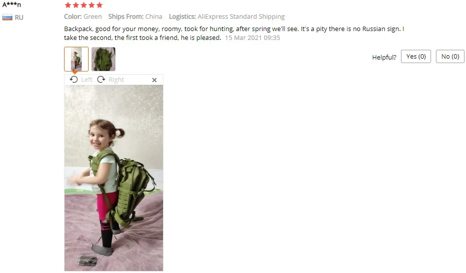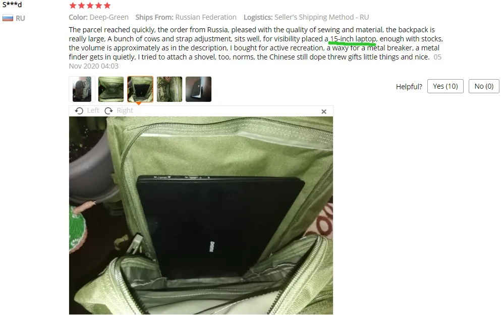 При оформлении заказа чётко сказал продавцу что рюкзак покупается в подарок брату. Попросил проверить перед отправкой. Он ответил - Уважаемый покупатель, мы проверим каждую упаковку перед отправкой.(дословно). Рюкзак пришел за 5 дней в Казань. Грязный. Нижнее несущее крепление пришито неправильно. При серьезной нагрузке оно порвется. Связался с продавцом. Он предложил купон на следущую покупку (на хер он нужен, с таким отношением) Открыл спор. Продавца не рекомендую.Отзыв дополню.