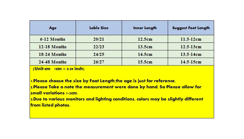 (Единица измерения: см, 1 см = 0,39 дюйма)1. Пожалуйста, выберите размер по длине стопы, возраст указан только для справки.2. Пожалуйста, обратите внимание, что измерения были сделаны вручную. Поэтому возможны незначительные погрешности в 1-2 см.3. Из-за различных мониторов и условий освещения цвета могут немного отличаться от приведенных фотографий.