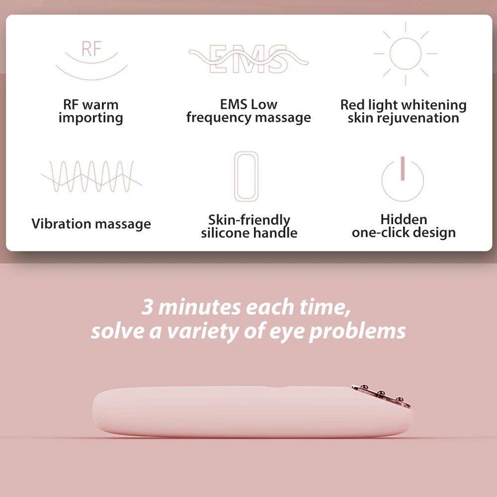 4.630 мм красный светильник, 40 ℃ постоянная температура не травмирует горячий компресс и 8000 раз в минуту высокочастотная вибрация может быстро импортировать крем для глаз, массировать кожу вокруг глаз, снять усталость, уменьшает тонкие линии и повышает эластичность кожи вокруг глаз.