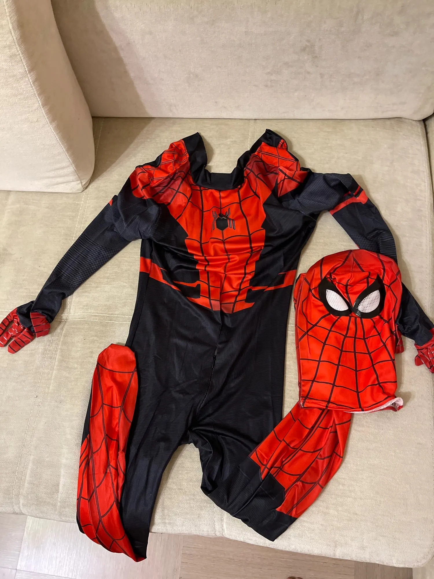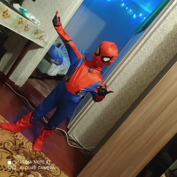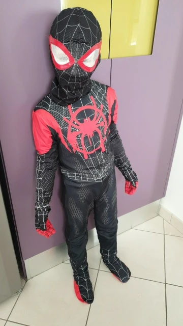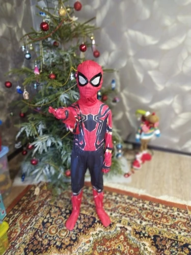 костюм очень хороший, хорошо прошит, красивый, пришёл быстро, на рост ребёнка 146 см, взяла р.160 сел отлично с минимальным запасом, так что имейте в виду маломерит. маска в самый раз, даже хотелось бы чуть больше. рекомендую, цвет материала и рисунок яркий и чёткий