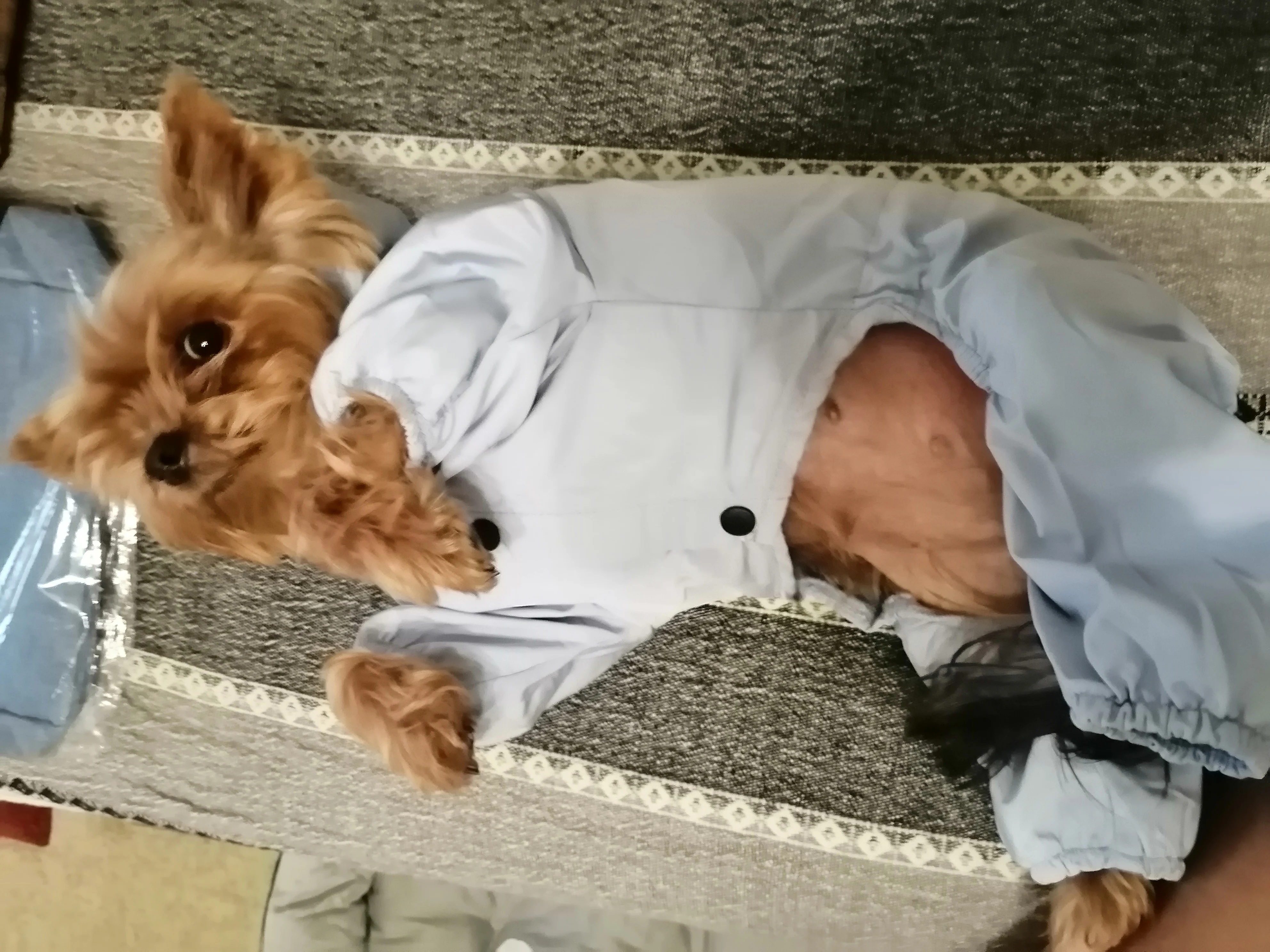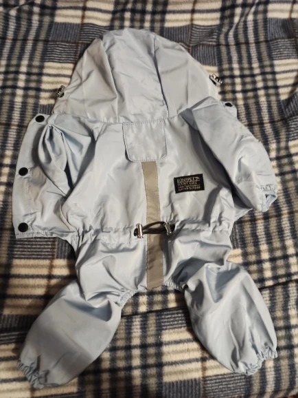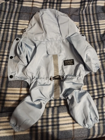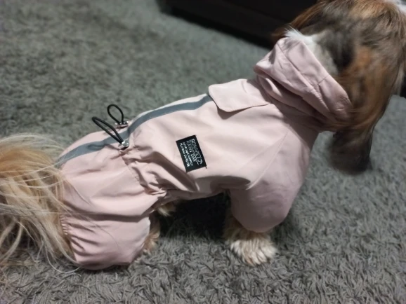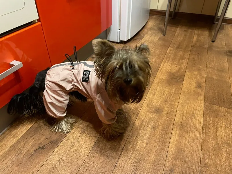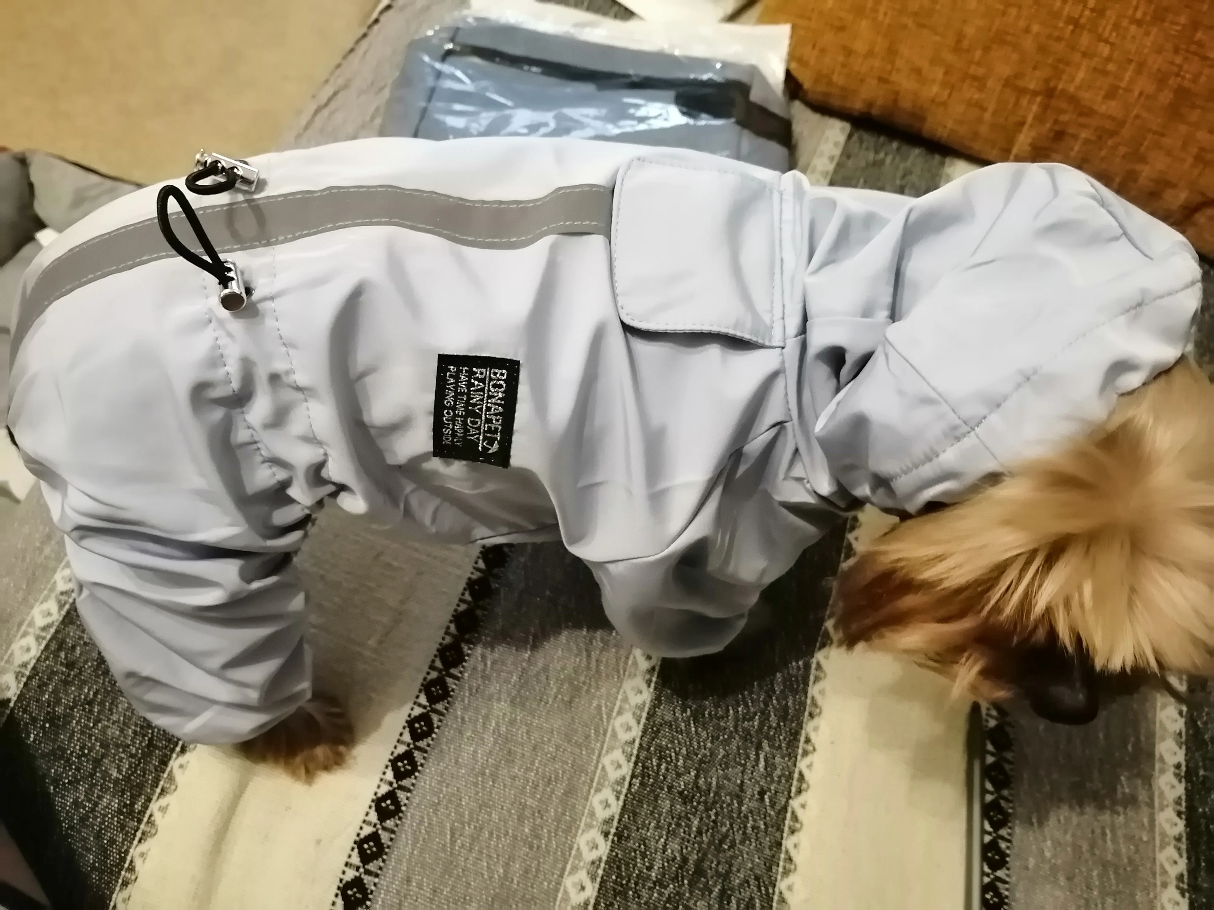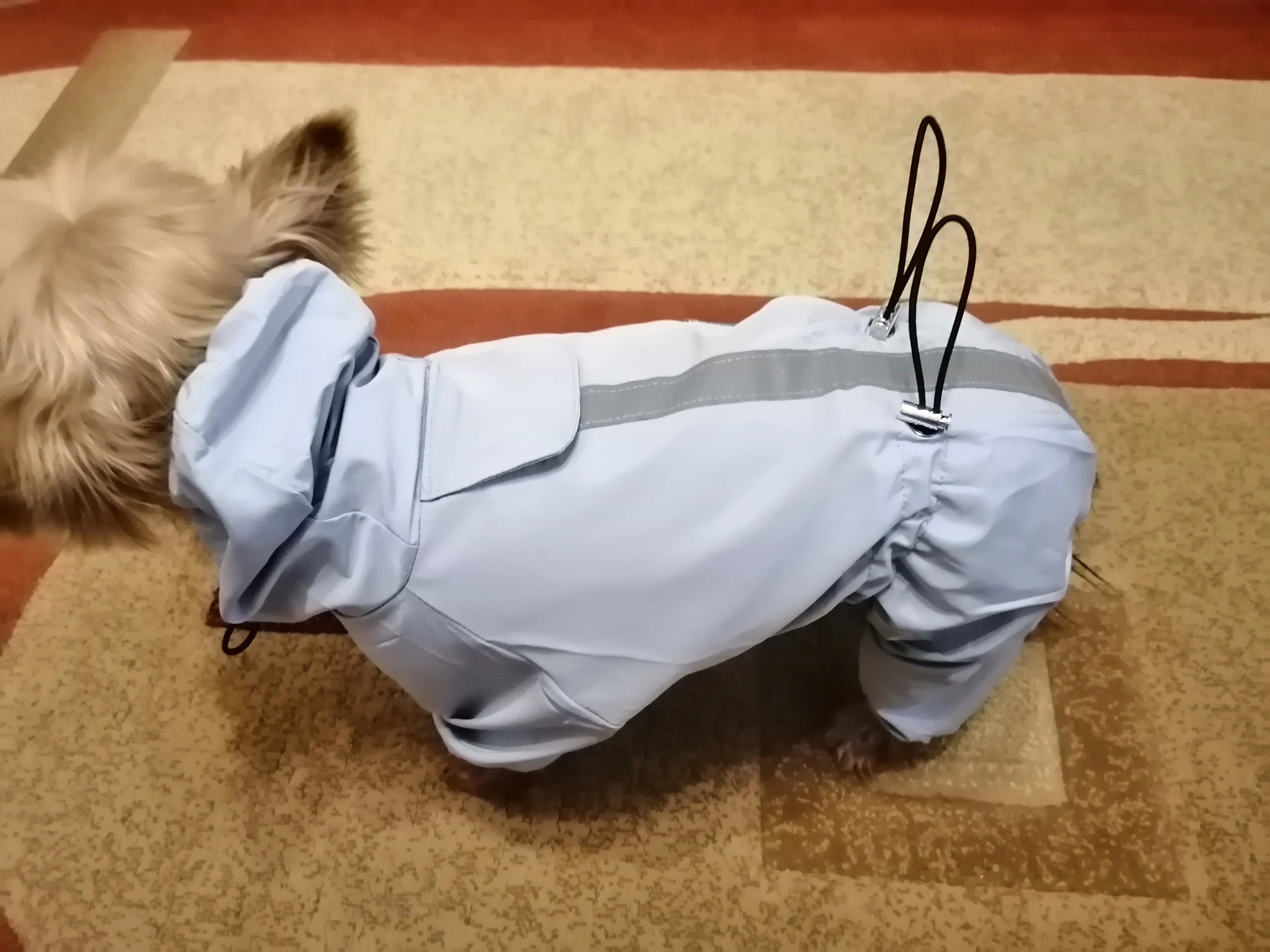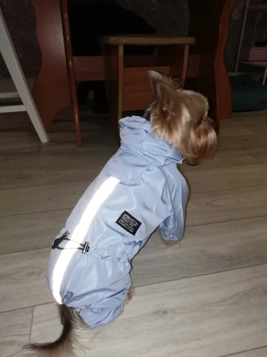 Заказала на йорка 4 кг размер L, идеально подошел, из плюсов - затягивается капюшон и есть возможность подтянуть в области спинки. Также полоска на спинке комбинезона светоотражающая, что тоже плюс для вечерних прогулок.