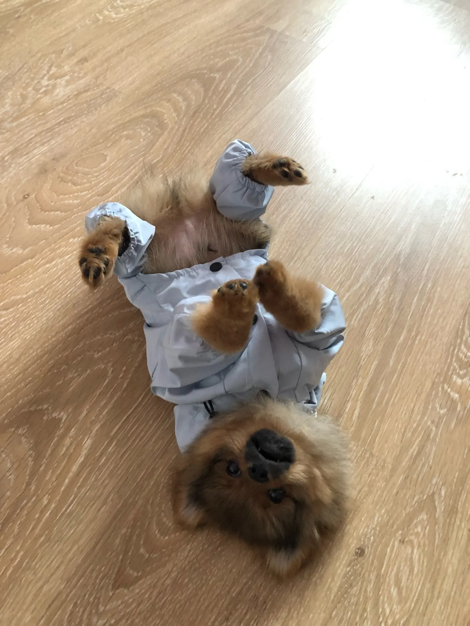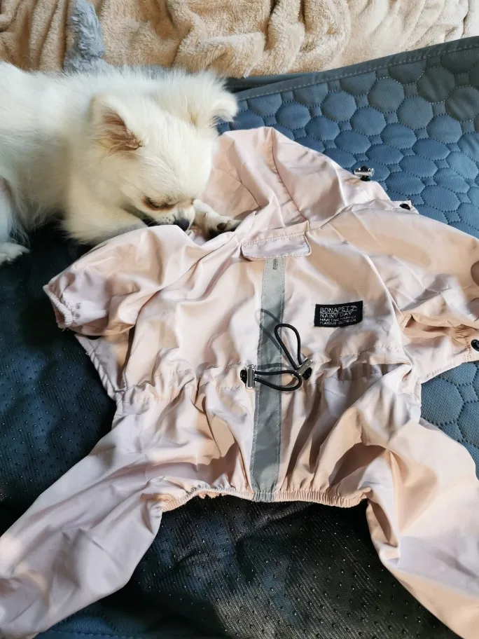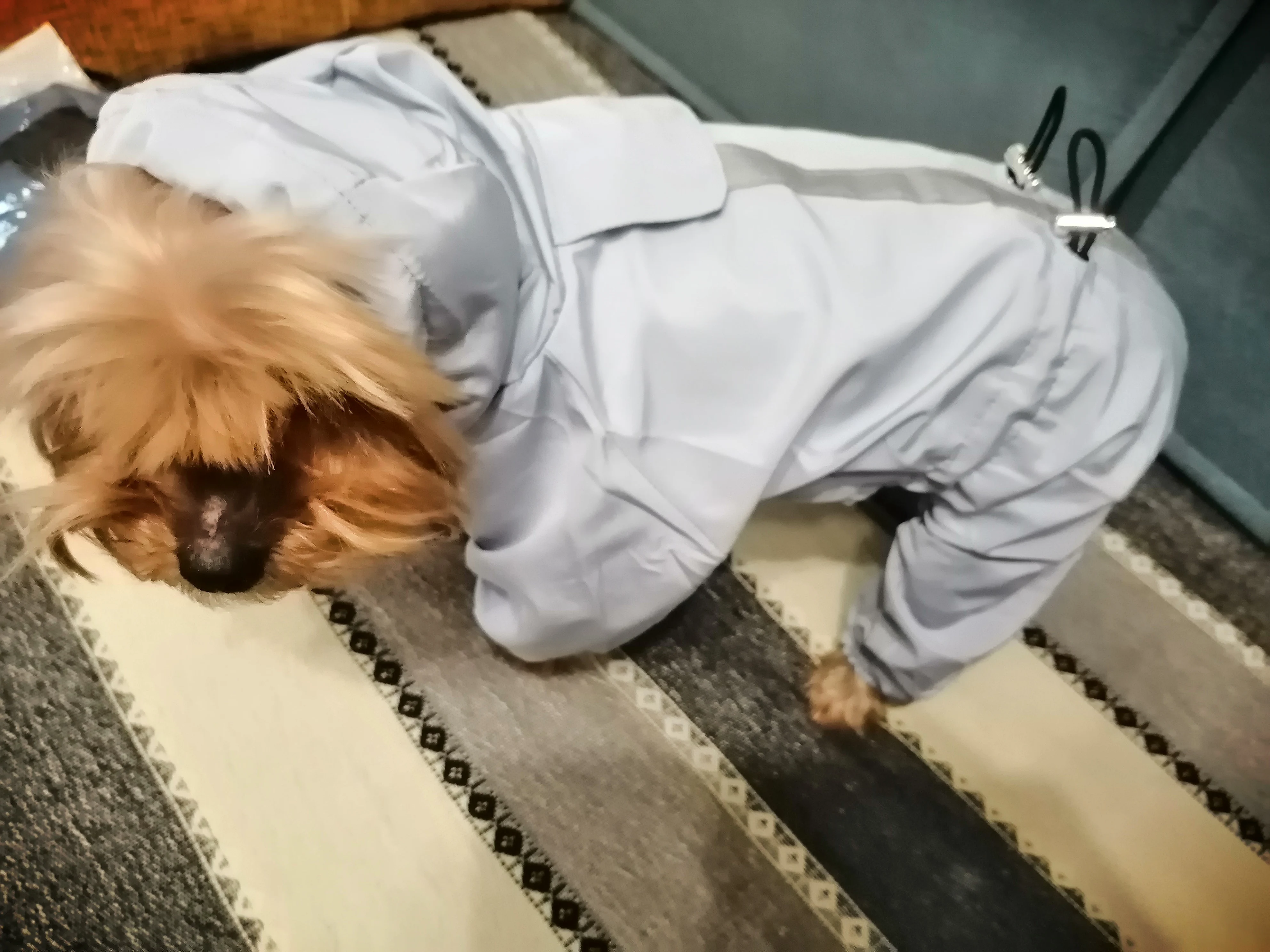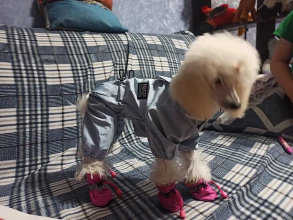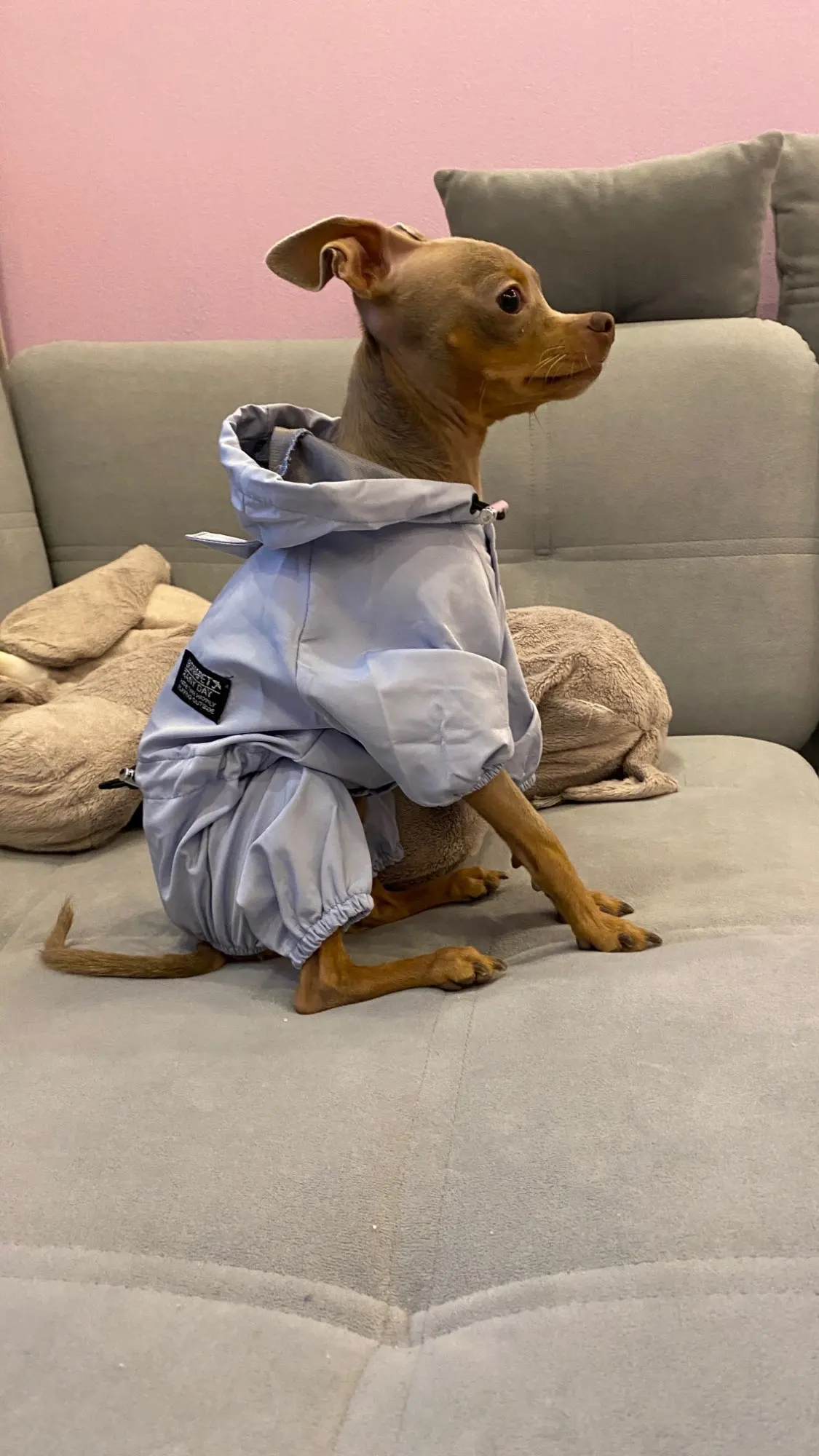 Заказала на йорка 4 кг размер L, идеально подошел, из плюсов - затягивается капюшон и есть возможность подтянуть в области спинки. Также полоска на спинке комбинезона светоотражающая, что тоже плюс для вечерних прогулок.