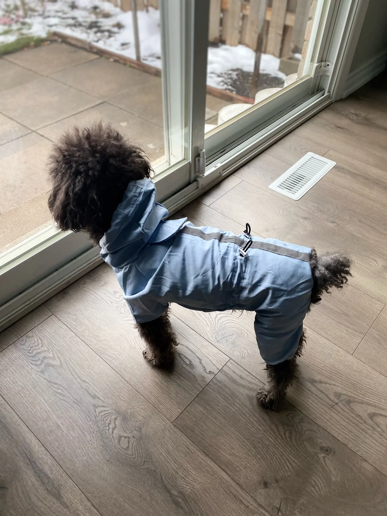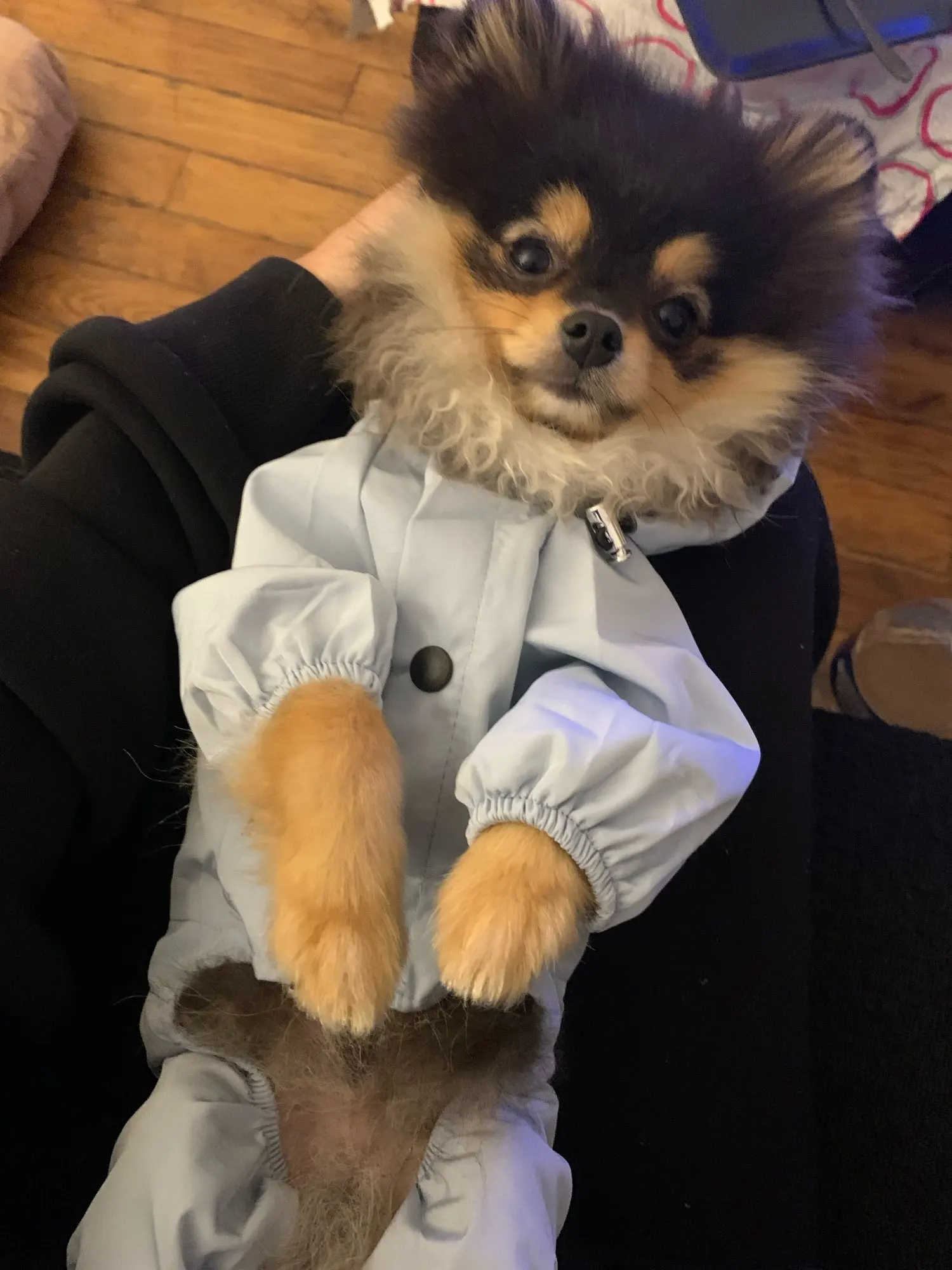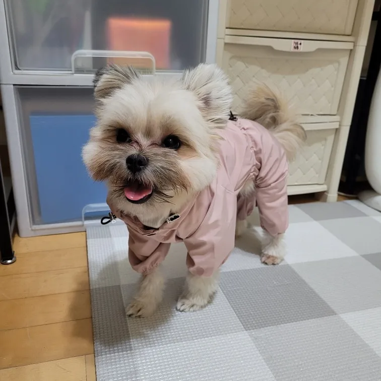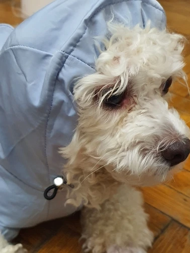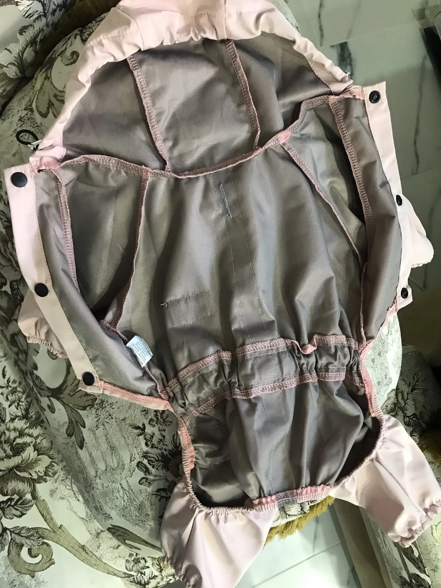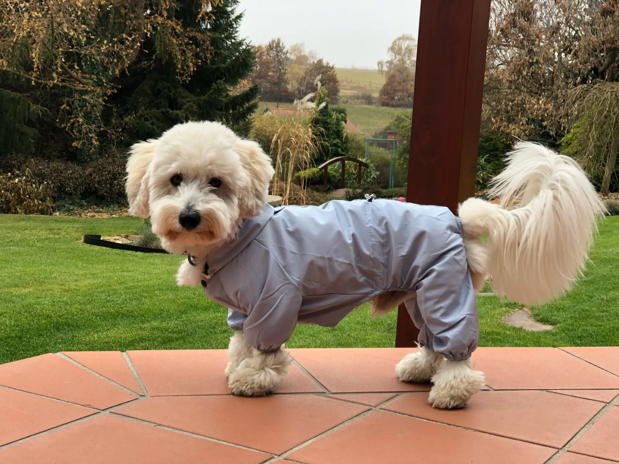 Заказала на йорка 4 кг размер L, идеально подошел, из плюсов - затягивается капюшон и есть возможность подтянуть в области спинки. Также полоска на спинке комбинезона светоотражающая, что тоже плюс для вечерних прогулок.