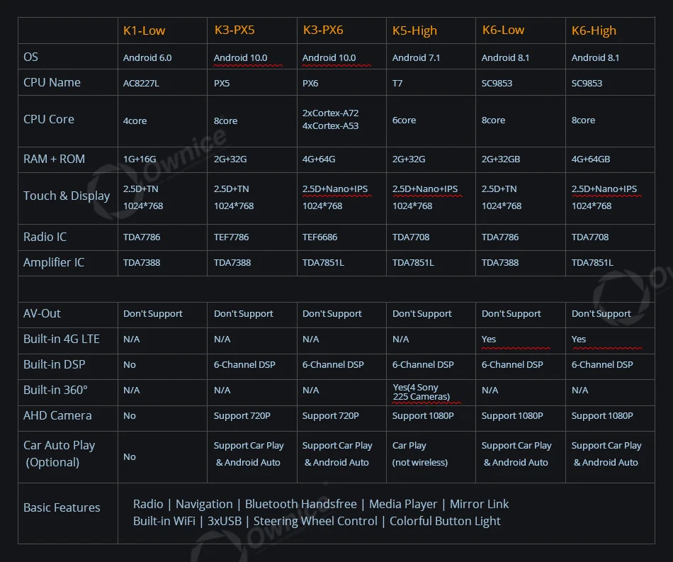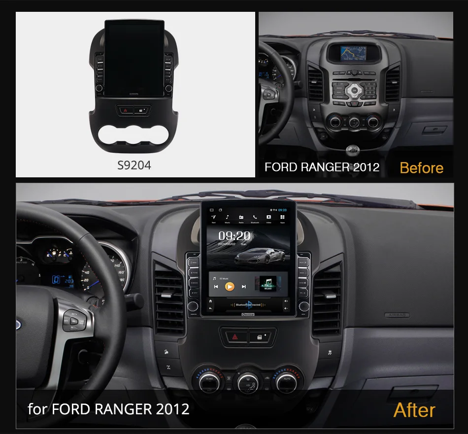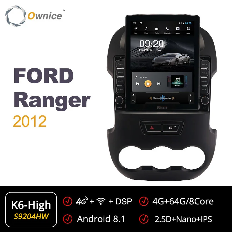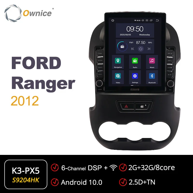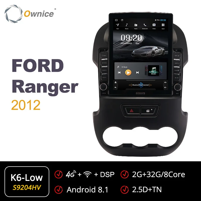 Подходит дляДля Ford Ranger 2012Если оригинальное автомобильное радио имеет функцию ниже, совместим ли блок Ownice Head?* Управление рулем --- да* Оригинальный радар или датчик упаковки --- да* Отображение информации о состоянии воздуха, синхронизация, настройка автомобиля (некоторые автомобили) --- да* Оригинальная AUX / USB/обратная камера --- Да, поддержка* Автоматическая парковка --- Да, поддержка* Оригинальный CD-плеер --- нет, не поддерживает* Оригинальный усилитель --- нет, не поддерживаетВнимание:Приведенная выше информация только для справки, иногда она может не быть совместима с некоторыми автомобилями, потому что автомобили производятся в разных странах в разных летних вариантах, спасибо за понимание. Блок Ⅱ: 9,7 "вертикальный Экран головное устройство (1024*768)K1-Low ------ AC8227L| Android 6,0 | 1G + 16GB | 2.5D + TN | Радио TDA7786 | Усилитель TDA7388K3-PX5 ------ PX5 | Android 10,0 | 2G + 32GB |2.5D + TN| Радио TDA7786 | Усилитель TDA7388К3-PX6------- PX6 | Android 10,0 | 4G + 64GB | 2.5D + Nano + IPS | Радио TEF6686 | Усилитель TDA7851LK5-High ------ T7 | Android 7,1 | 2G + 32GB | 2.5D + Nano + IPS | Радио TDA7708 | Усилитель TDA7851LK6-Low ------- SC9853 | Android 8,1 | 2G + 32GB | 2.5D + TN | Радио TDA7786 | Усилитель TDA7388K6-High ------ SC9853 | Android 8,1 | 4G + 64GB | 2.5D + Nano + IPS | Радио TDA7708 | Усилитель TDA7851L