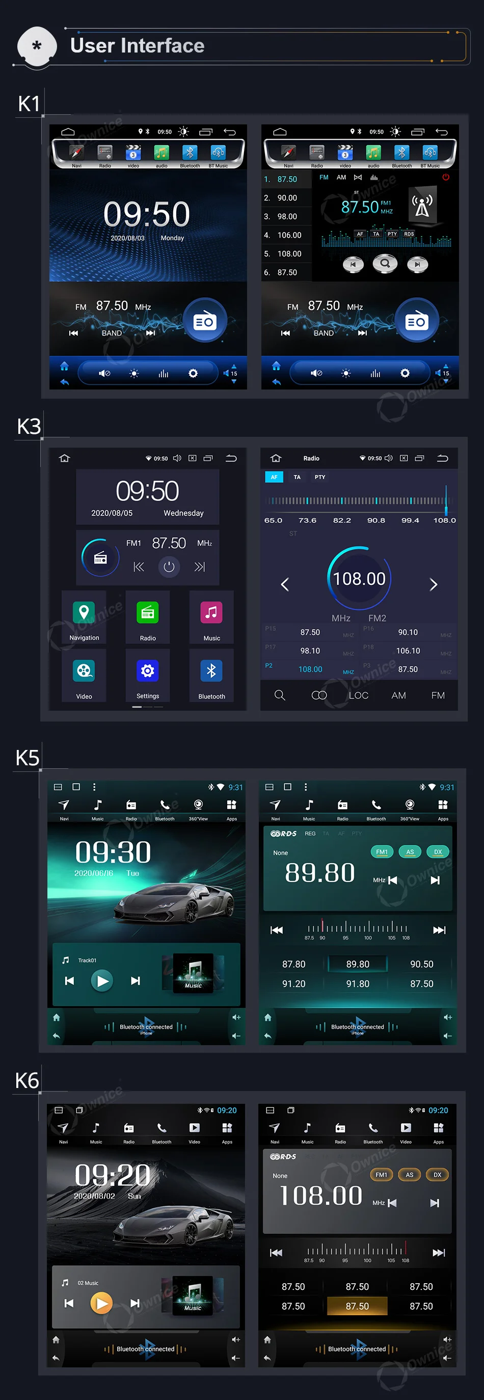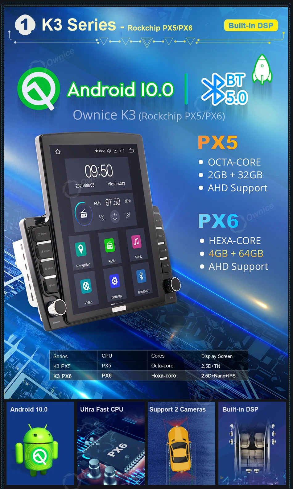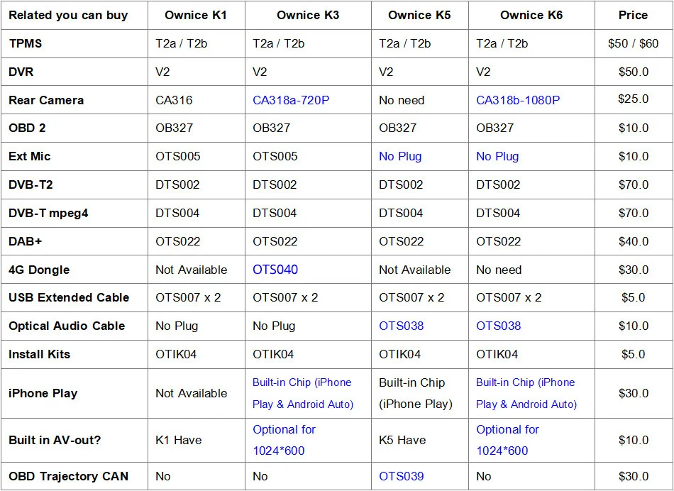 Подходит дляДля Ford Ranger 2012Если оригинальное автомобильное радио имеет функцию ниже, совместим ли блок Ownice Head?* Управление рулем --- да* Оригинальный радар или датчик упаковки --- да* Отображение информации о состоянии воздуха, синхронизация, настройка автомобиля (некоторые автомобили) --- да* Оригинальная AUX / USB/обратная камера --- Да, поддержка* Автоматическая парковка --- Да, поддержка* Оригинальный CD-плеер --- нет, не поддерживает* Оригинальный усилитель --- нет, не поддерживаетВнимание:Приведенная выше информация только для справки, иногда она может не быть совместима с некоторыми автомобилями, потому что автомобили производятся в разных странах в разных летних вариантах, спасибо за понимание. Блок Ⅱ: 9,7 "вертикальный Экран головное устройство (1024*768)K1-Low ------ AC8227L| Android 6,0 | 1G + 16GB | 2.5D + TN | Радио TDA7786 | Усилитель TDA7388K3-PX5 ------ PX5 | Android 10,0 | 2G + 32GB |2.5D + TN| Радио TDA7786 | Усилитель TDA7388К3-PX6------- PX6 | Android 10,0 | 4G + 64GB | 2.5D + Nano + IPS | Радио TEF6686 | Усилитель TDA7851LK5-High ------ T7 | Android 7,1 | 2G + 32GB | 2.5D + Nano + IPS | Радио TDA7708 | Усилитель TDA7851LK6-Low ------- SC9853 | Android 8,1 | 2G + 32GB | 2.5D + TN | Радио TDA7786 | Усилитель TDA7388K6-High ------ SC9853 | Android 8,1 | 4G + 64GB | 2.5D + Nano + IPS | Радио TDA7708 | Усилитель TDA7851L