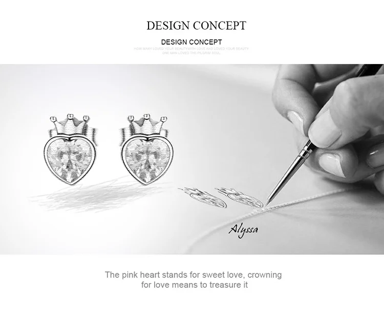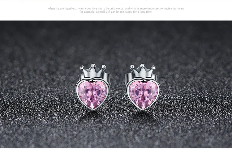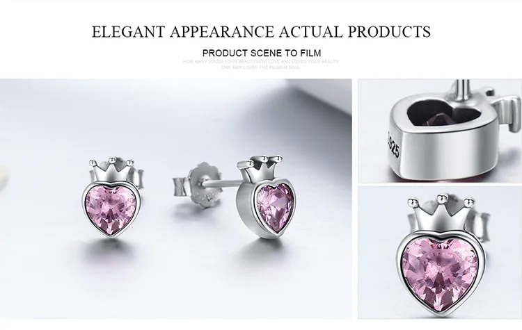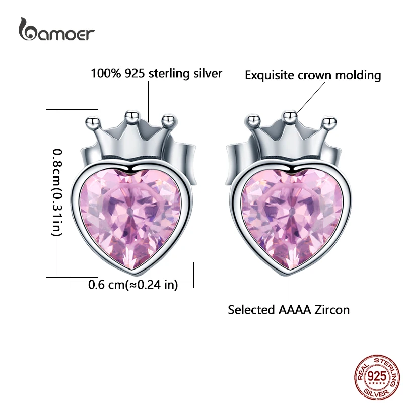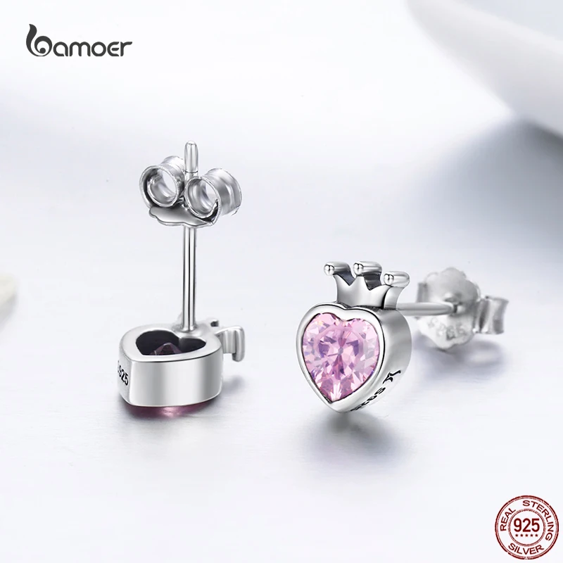 Женские серьги-гвоздики Bamoer, серьги из стерлингового серебра 925 пробы с розовым сердцем и короной, роскошные серебряные ювелирные изделия, подарок SCE174