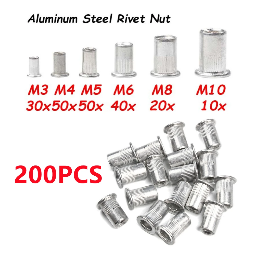 Заклепочные гайки M3 M4 M5 M6 M8 M10, 200 шт.компл., алюминиевые заклепочные гайки разных размеров, набор заклепок с плоской головкой, набор гаек с резьбой