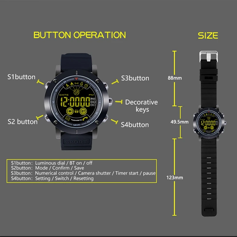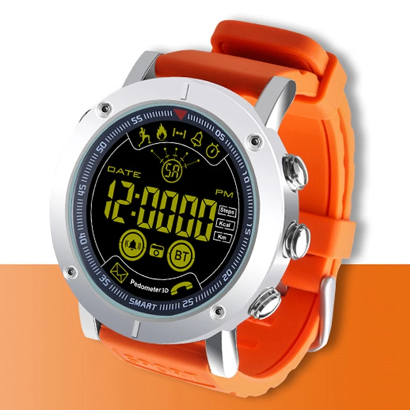 Новое высокое качествоСпортивный модный стильДисплей полного времени, календарь, отображение датыБудильник и секундомерМониторинг ходьбы/физических упражненийСпортивное хранилище данныхПриложение и фоновый сервер поддерживают глобальные сетиНапоминание информацииУдаленная камераСветящийся циферблатНапоминание о низком заряде батареиВходящий вызовЗащита от водыПоддержка Bluetooth системыОтличный водонепроницаемый класс 5 АТМ, поддержка плавания, пожеланий, купания (за исключением горячей воды) и т. Д.Не носите его в сауне, не нажимайте кнопки под водойЯзыки приложения: английский, французский, испанский, португальский, итальянский, немецкий, русский, арабский, японский, корейский, китайский (упрощенный, традиционный)Цвет: оранжевый/синий/черныйМатериал: силикон + металлРазмеры: 48x48x14mmПосылка:1 x часыТолько вышеуказанная посылка, другие товары не включены.Примечание: светильник и различные дисплеи могут привести к тому, что цвет товара на картинке немного отличается от реального. Допускается погрешность в измерениях +/- 1-3 см.